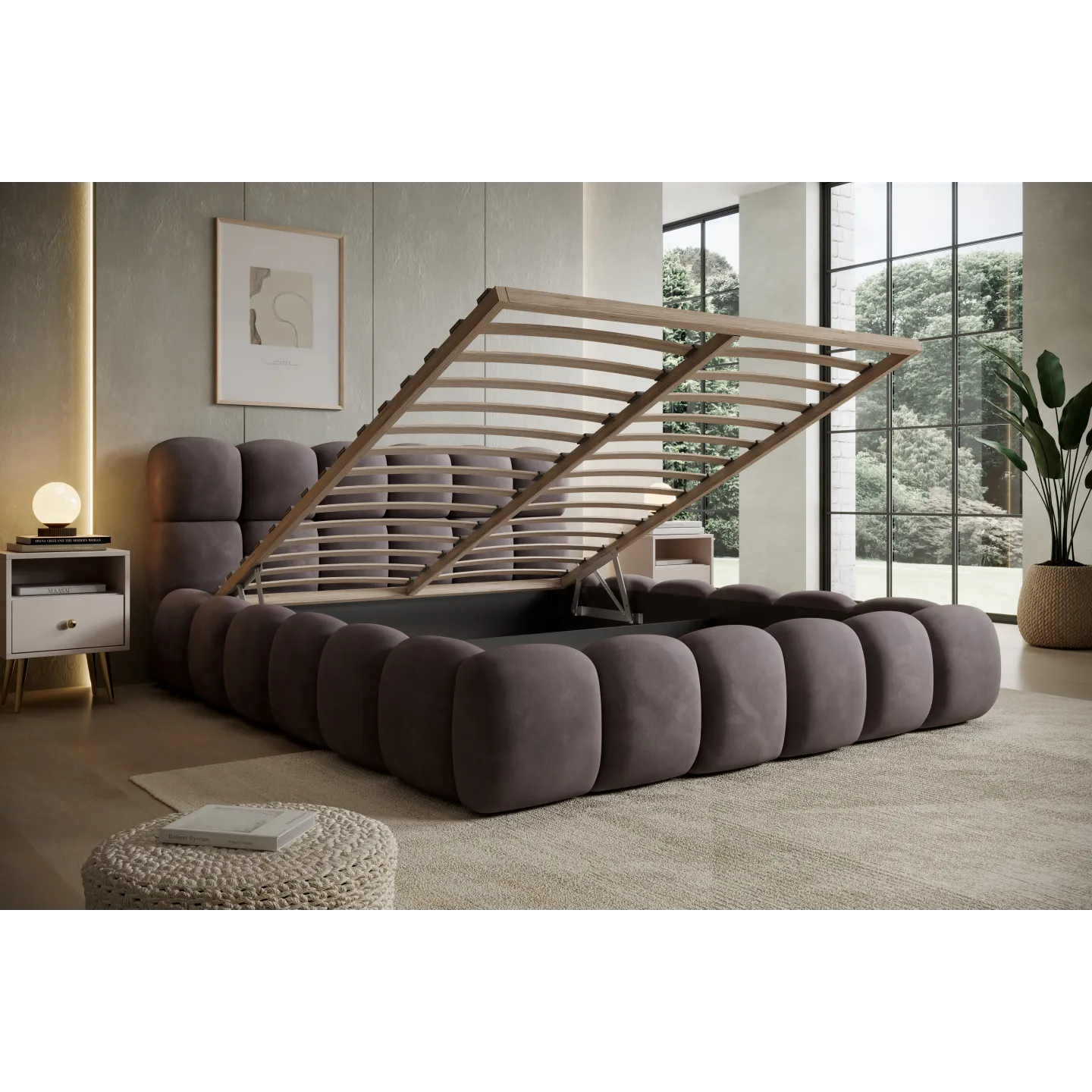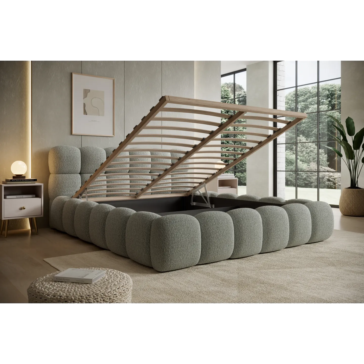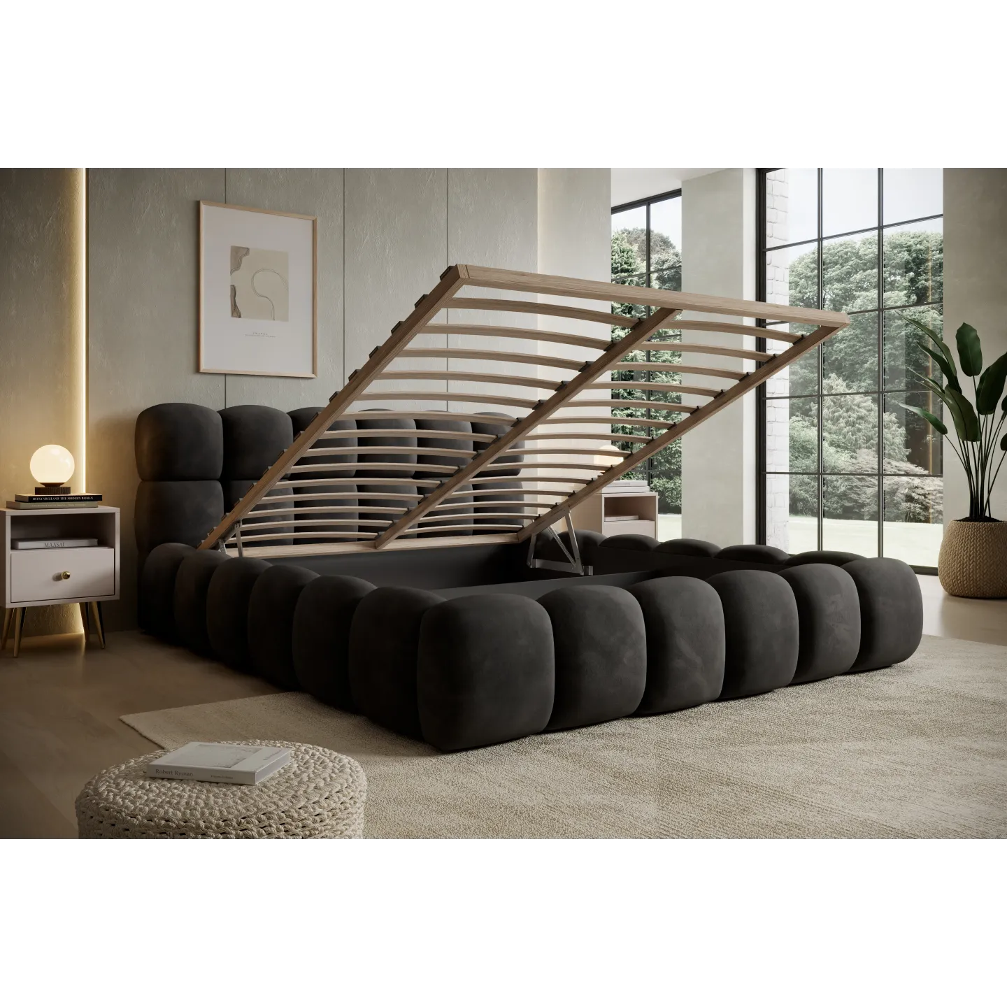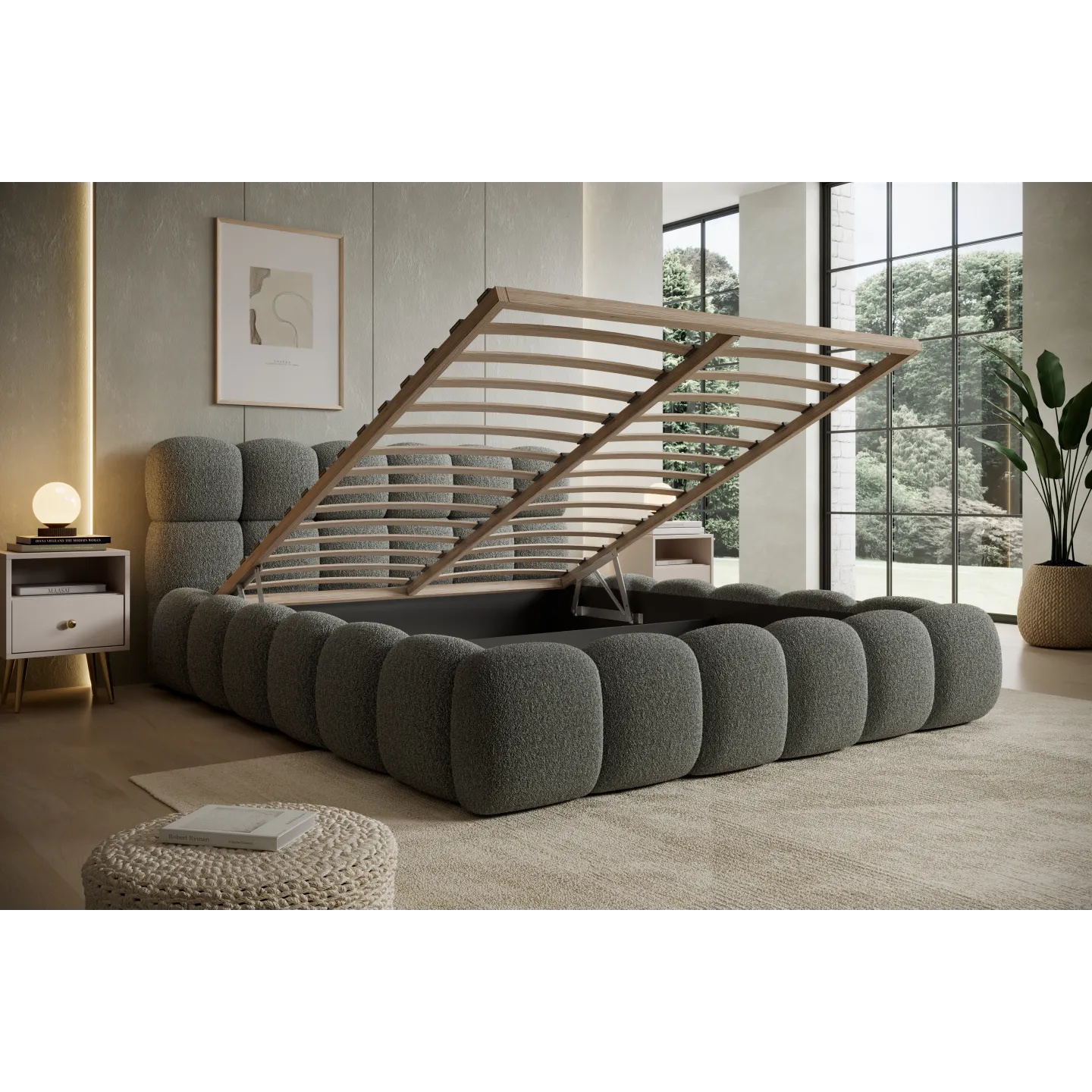 Der integrierte Bettkasten bietet großzügigen Stauraum für Decken, Kissen oder saisonale Bettwäsche. So bleibt das Schlafzimmer aufgeräumt, und Sie nutzen den Platz unter der Liegefläche optimal aus. Gerade in Stadtwohnungen oder kleineren Räumen ist dies ein großer Vorteil.