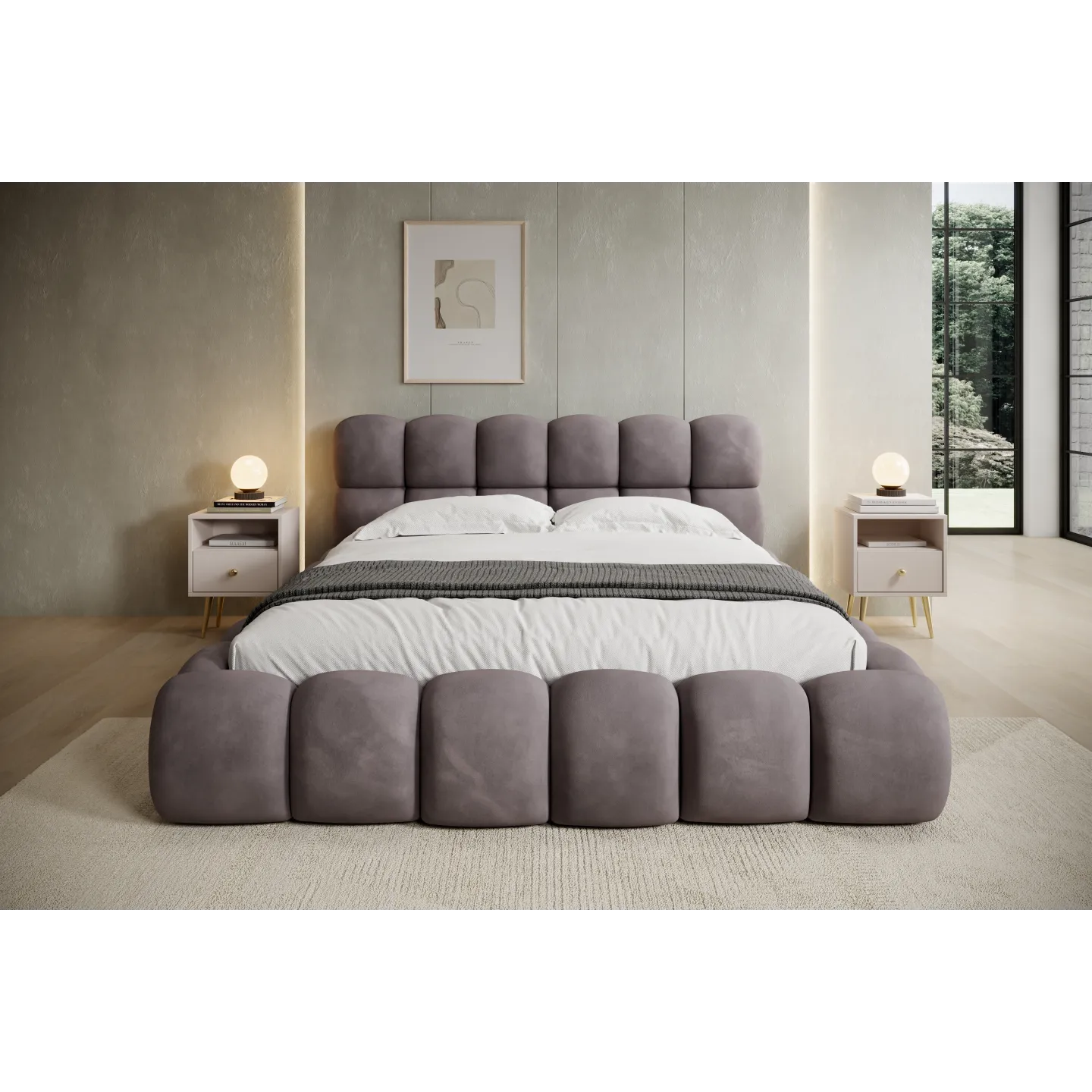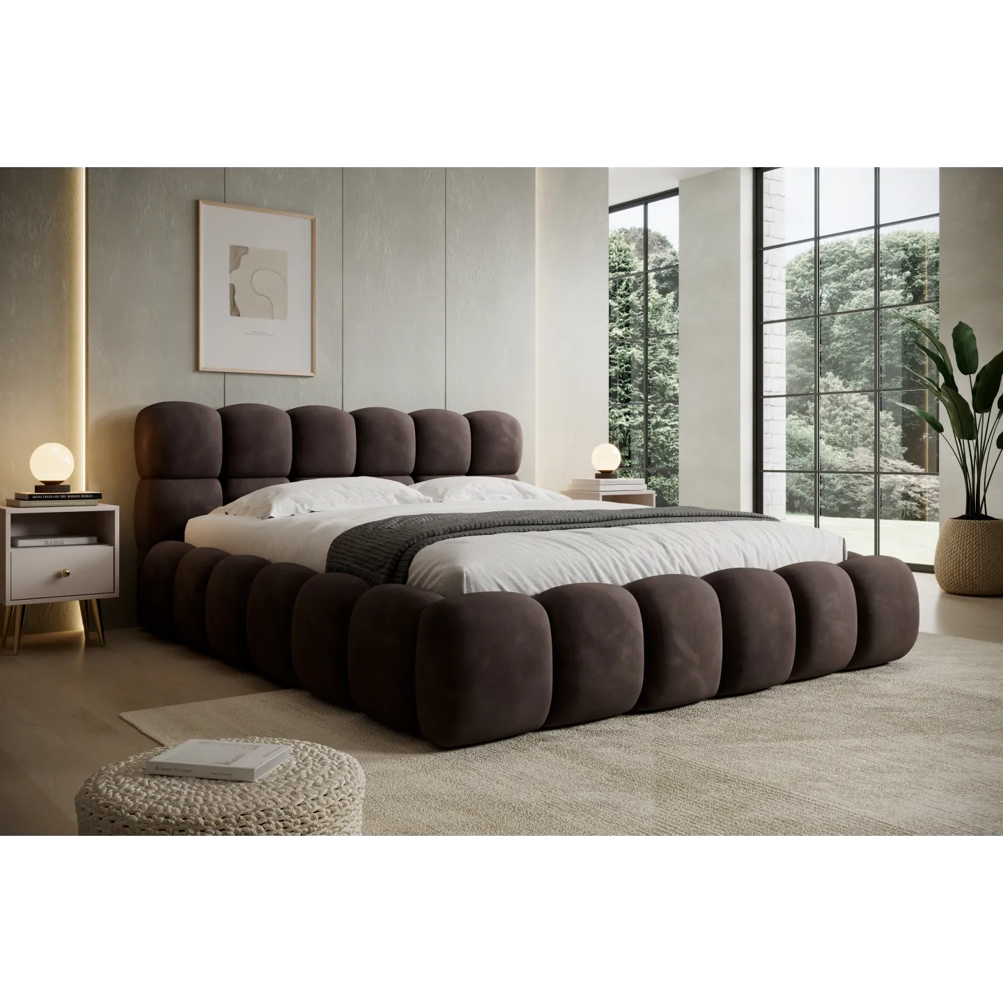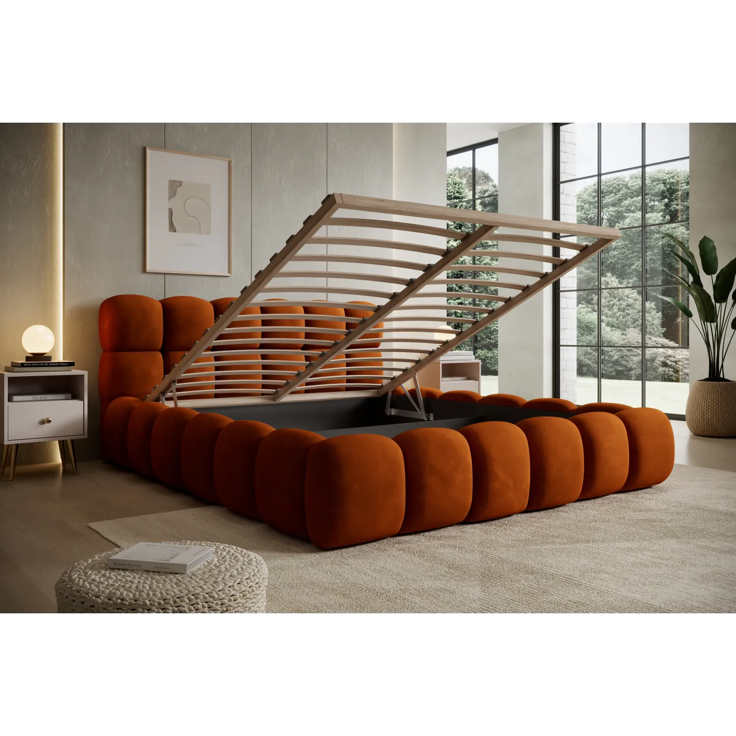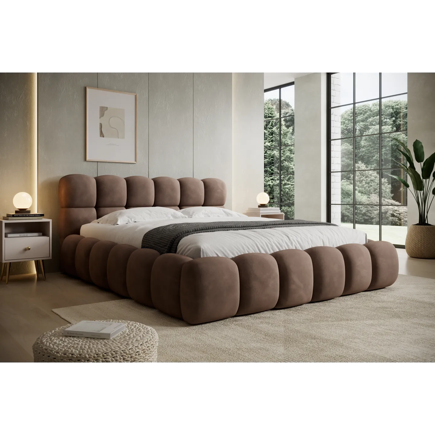 Das voluminöse „Bubble“-Design mit weich abgerundeten Formen verleiht dem Bett eine einladende, fast skulpturale Wirkung. Der warme Terracotta-Ton des Veloursbezugs schafft eine gemütliche Atmosphäre und harmoniert hervorragend mit hellen Wänden, Holz oder minimalistischen Einrichtungskonzepten.