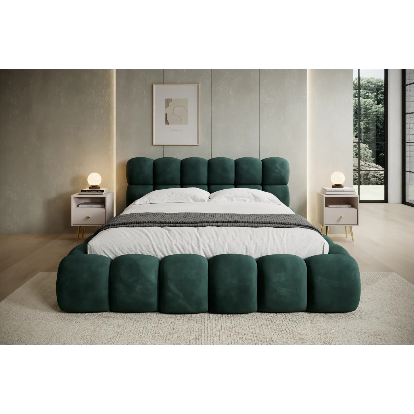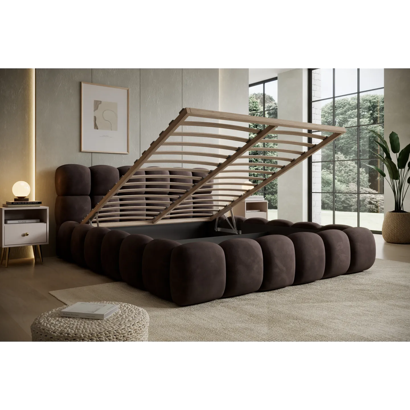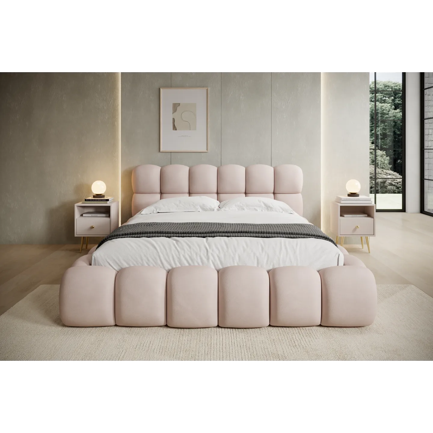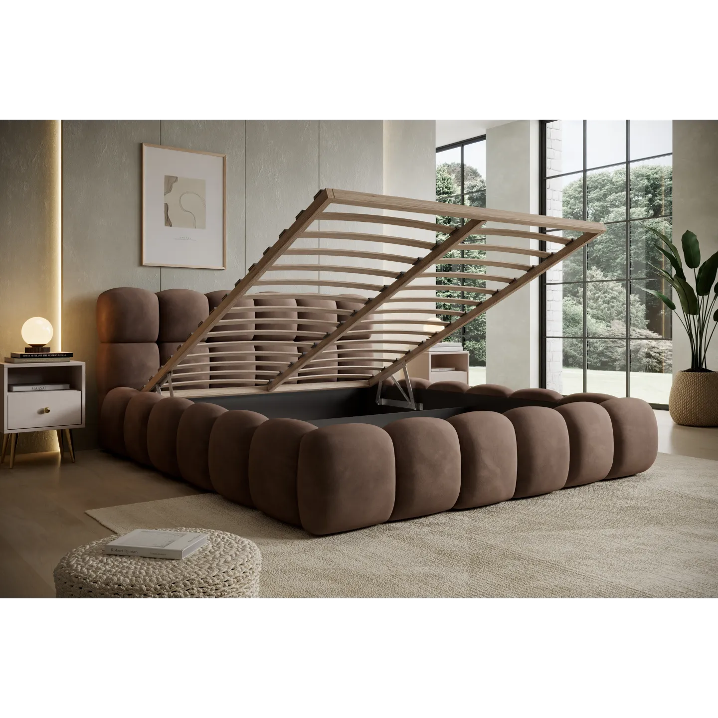 Das voluminöse „Bubble“-Design mit weich abgerundeten Formen verleiht dem Bett eine einladende, fast skulpturale Wirkung. Der warme Terracotta-Ton des Veloursbezugs schafft eine gemütliche Atmosphäre und harmoniert hervorragend mit hellen Wänden, Holz oder minimalistischen Einrichtungskonzepten.