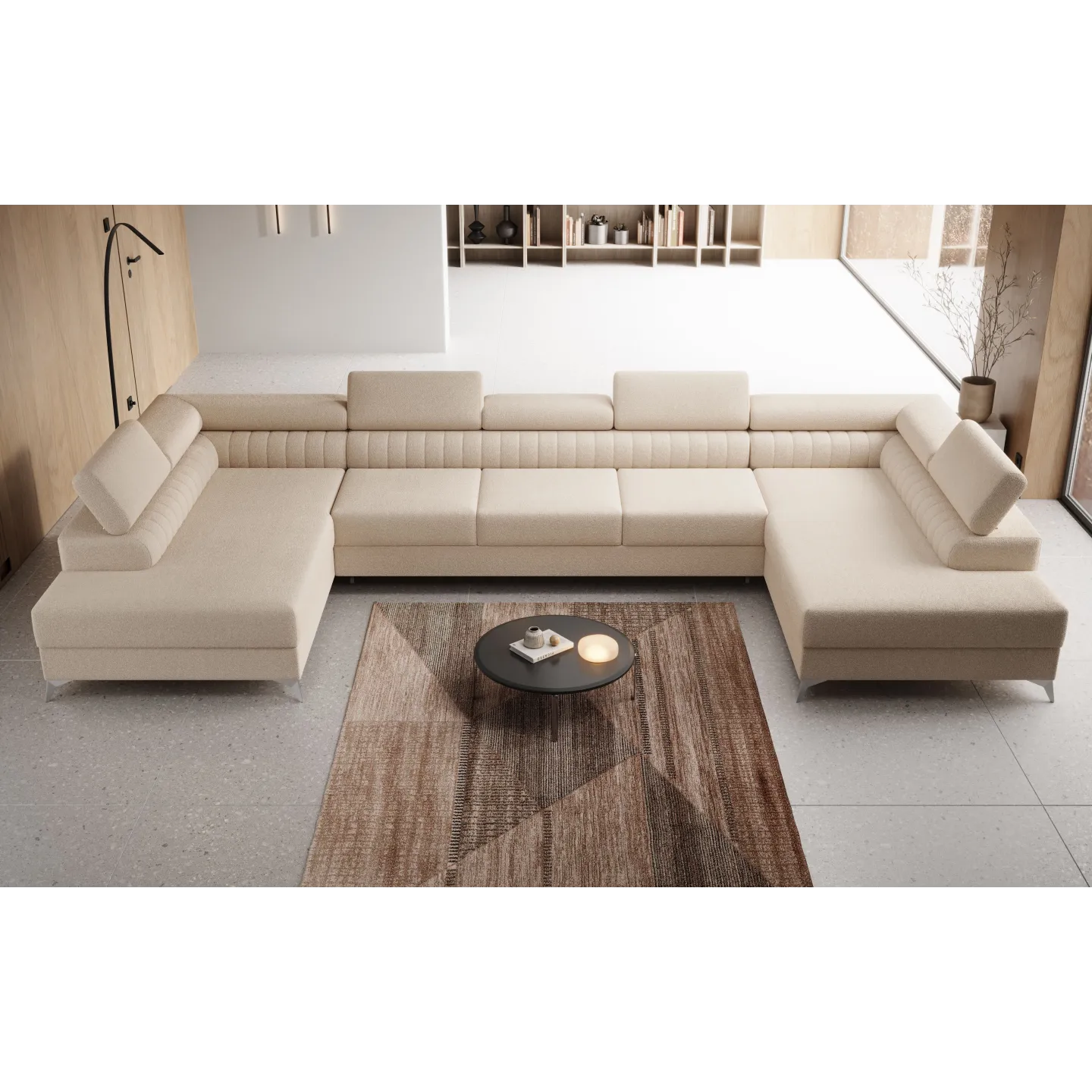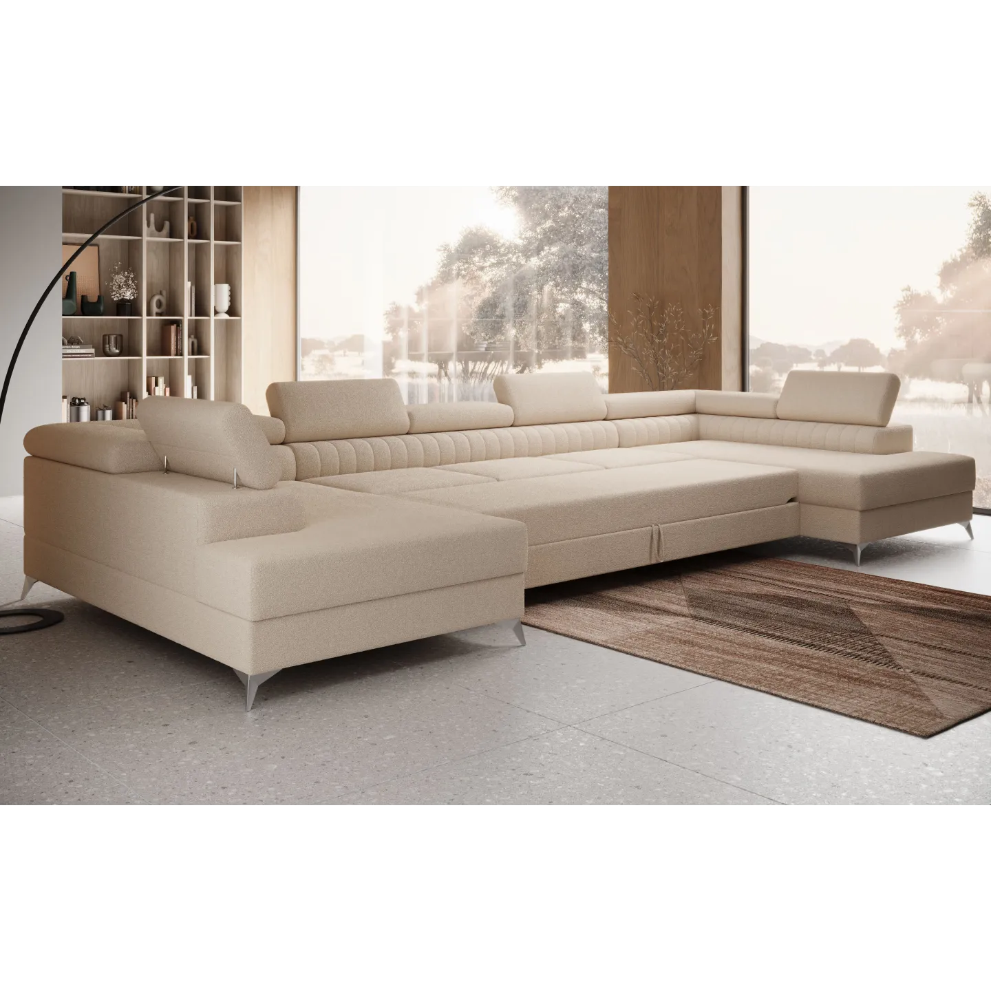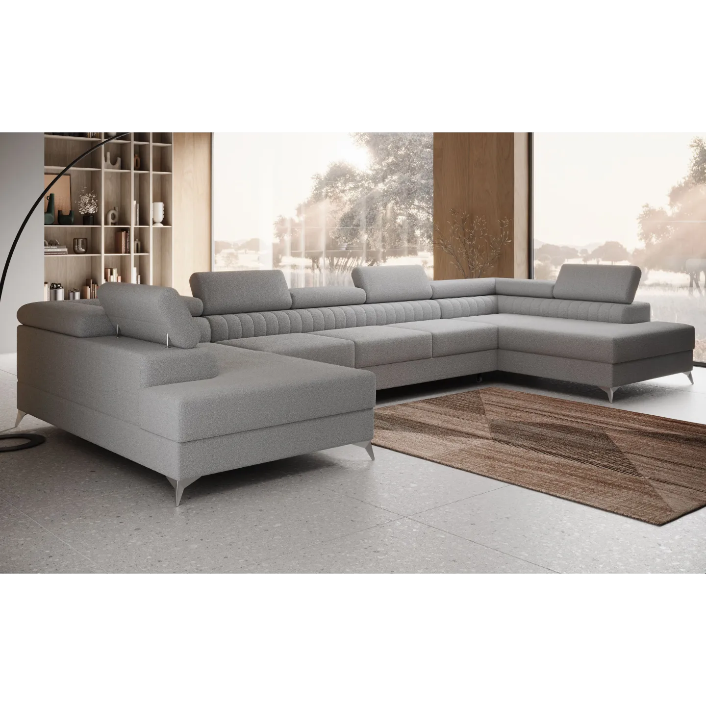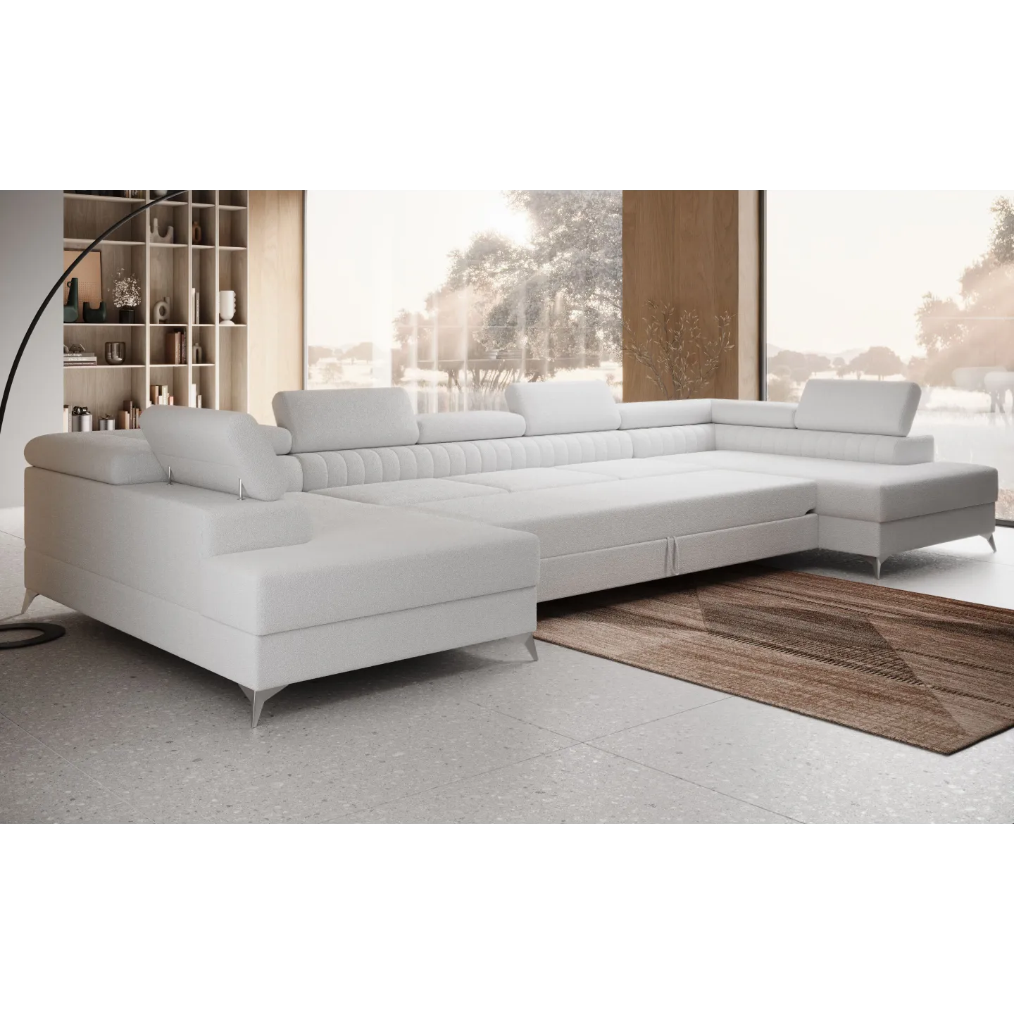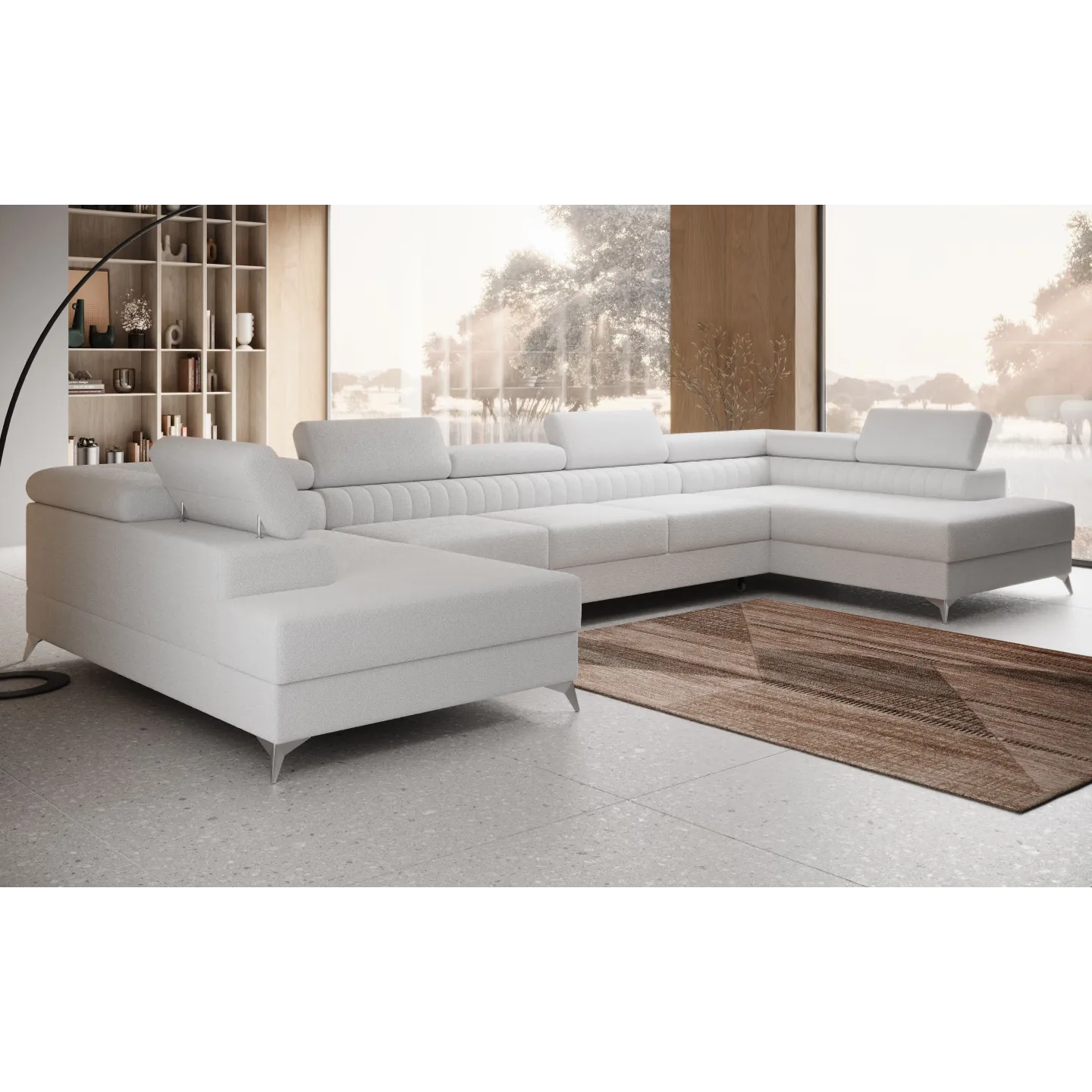 Das Schlafsofa FERMO mit Bettkasten U-Form präsentiert sich als symmetrische Wohnlandschaft: Links eine großzügige Ottomane, rechts ein verlängerter Longchair, dazwischen ein langes, mehrsitziges Polstersegment. Die Rückenlehne ist mit einer markanten Steppung versehen, die den hochwertigen Charakter der Polsterung betont und dem Sofa einen modernen, strukturierten Look verleiht.