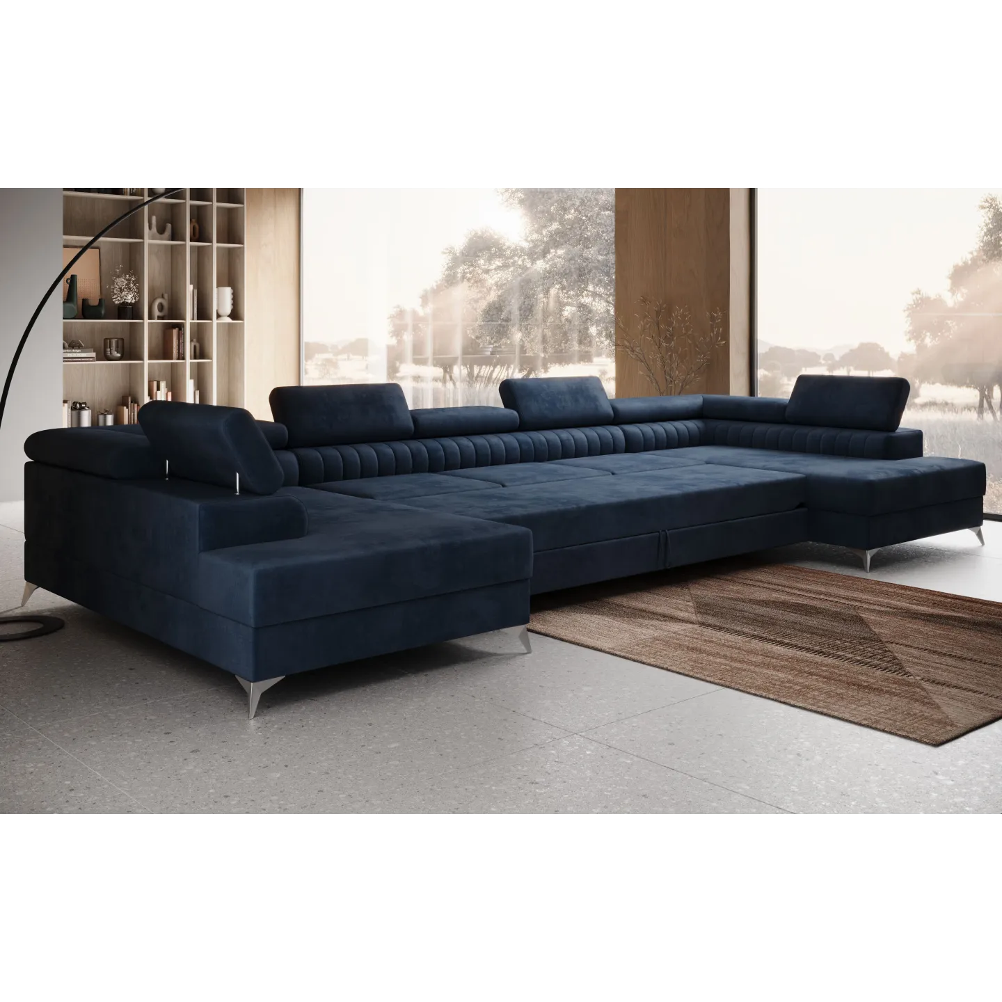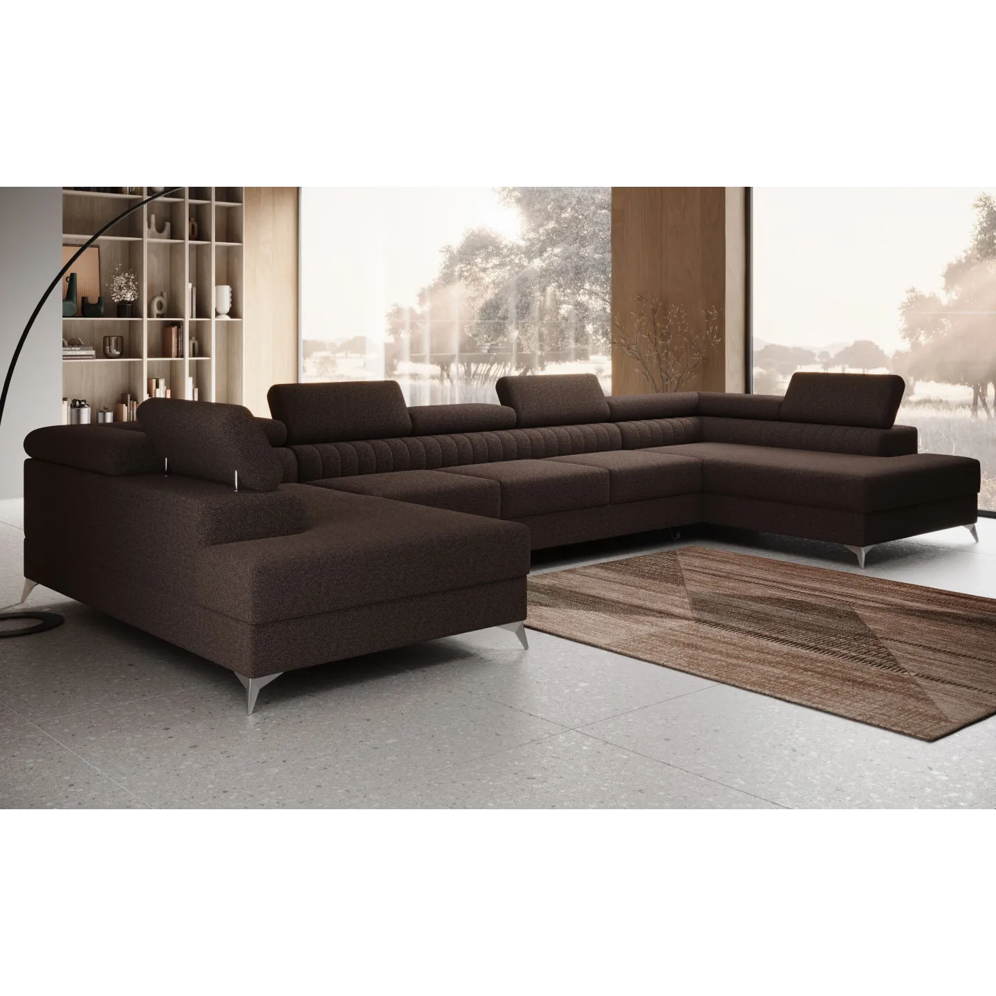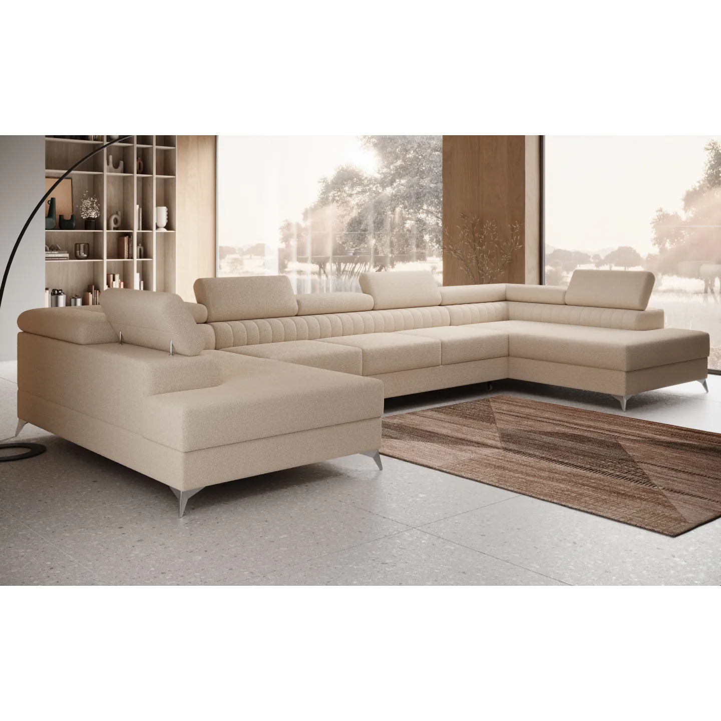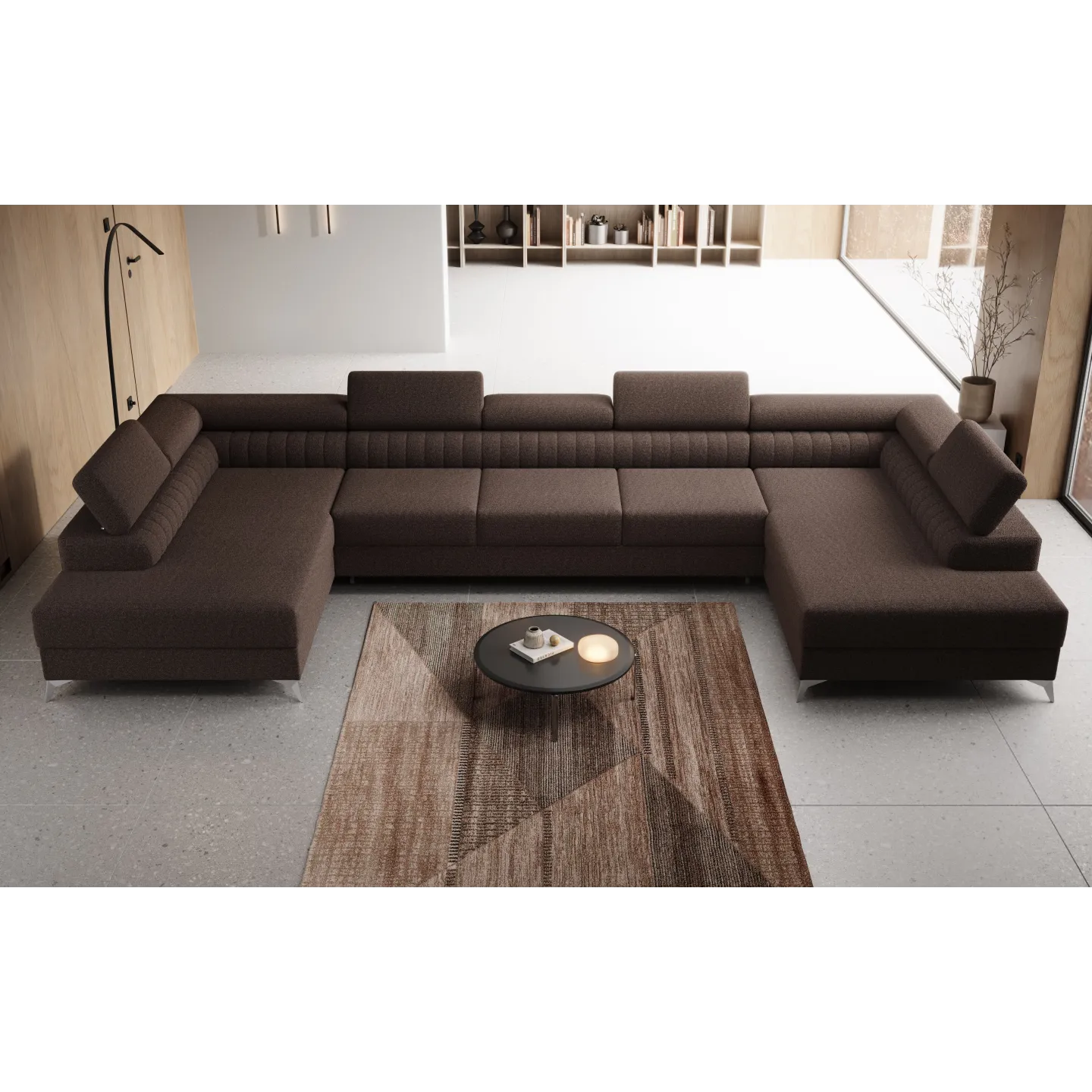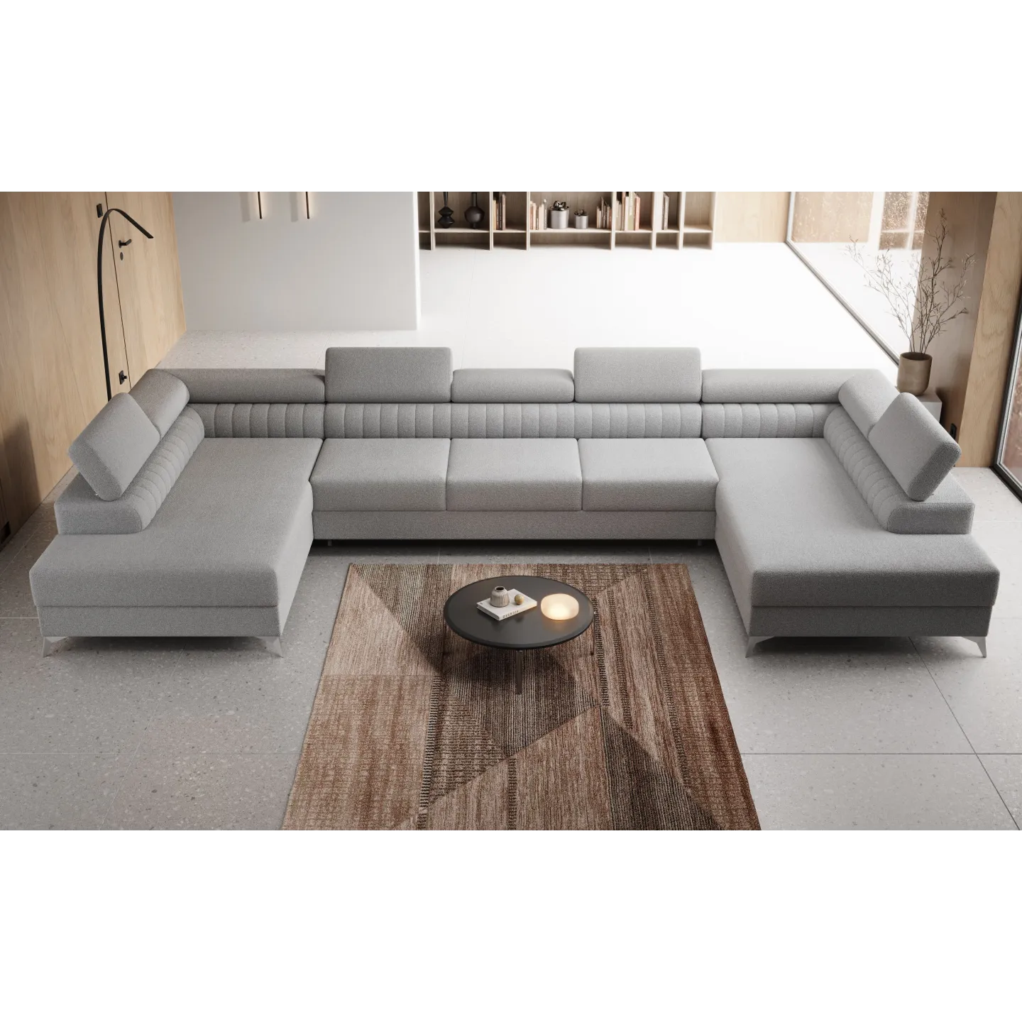 Das Schlafsofa FERMO mit Bettkasten U-Form präsentiert sich als symmetrische Wohnlandschaft: Links eine großzügige Ottomane, rechts ein verlängerter Longchair, dazwischen ein langes, mehrsitziges Polstersegment. Die Rückenlehne ist mit einer markanten Steppung versehen, die den hochwertigen Charakter der Polsterung betont und dem Sofa einen modernen, strukturierten Look verleiht.