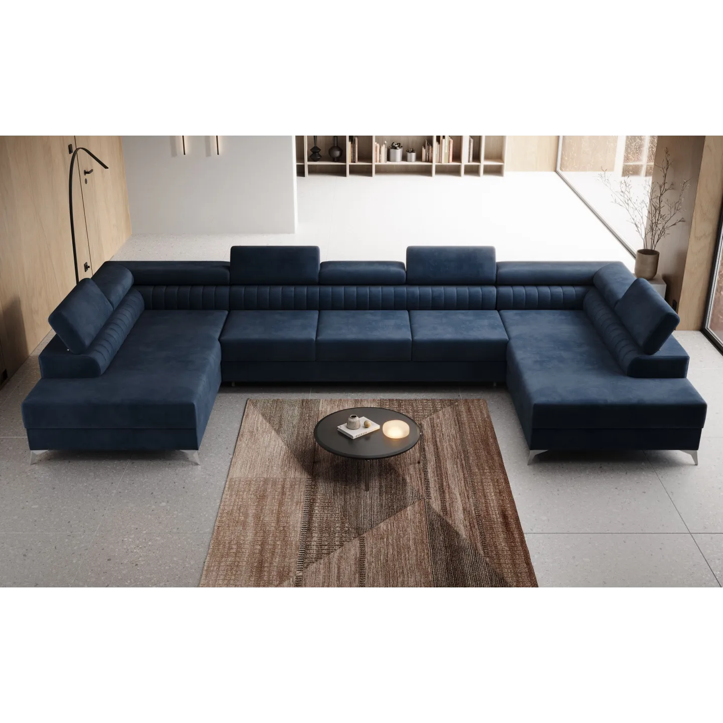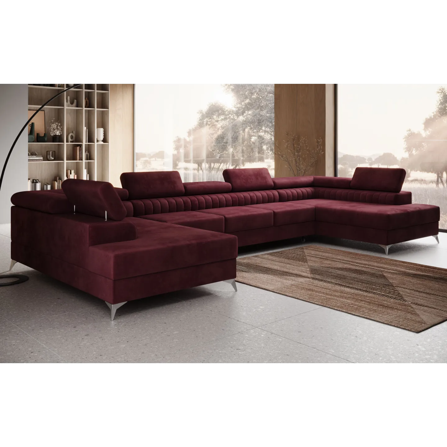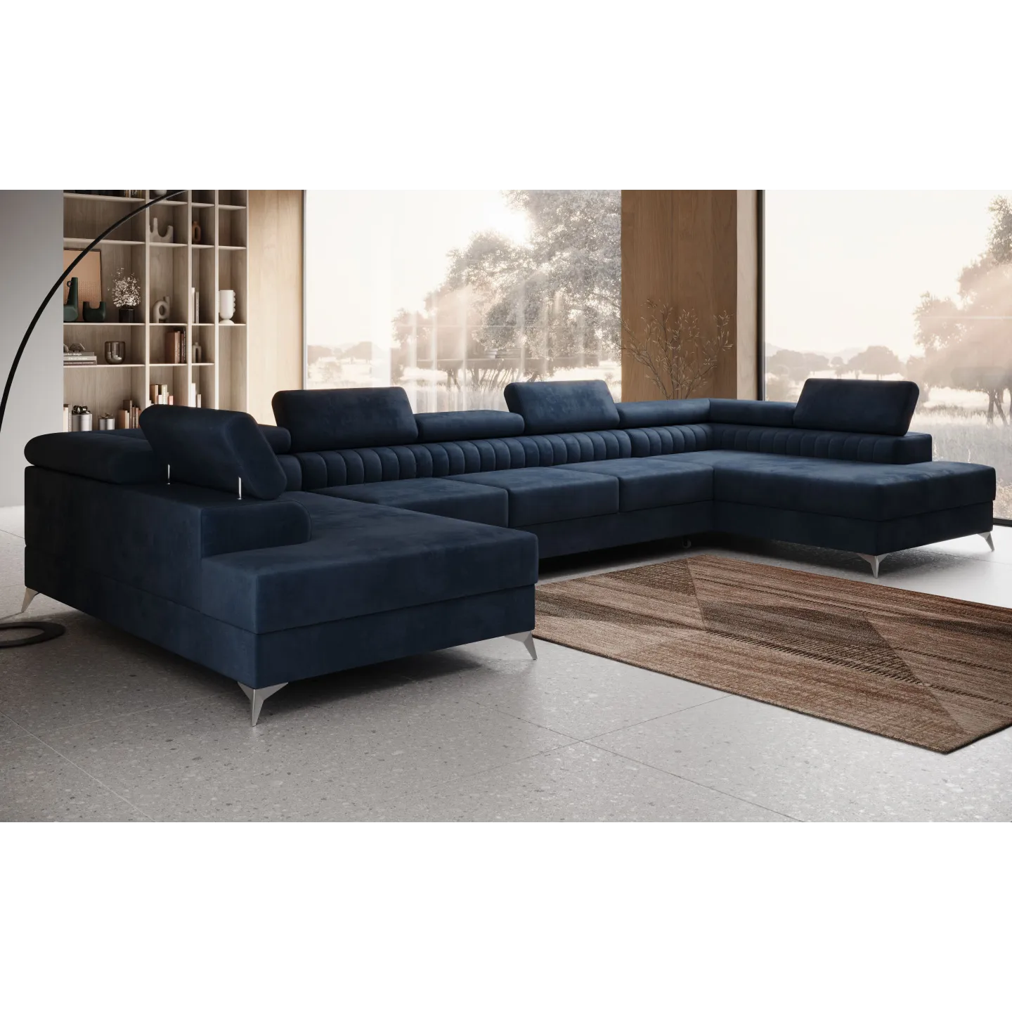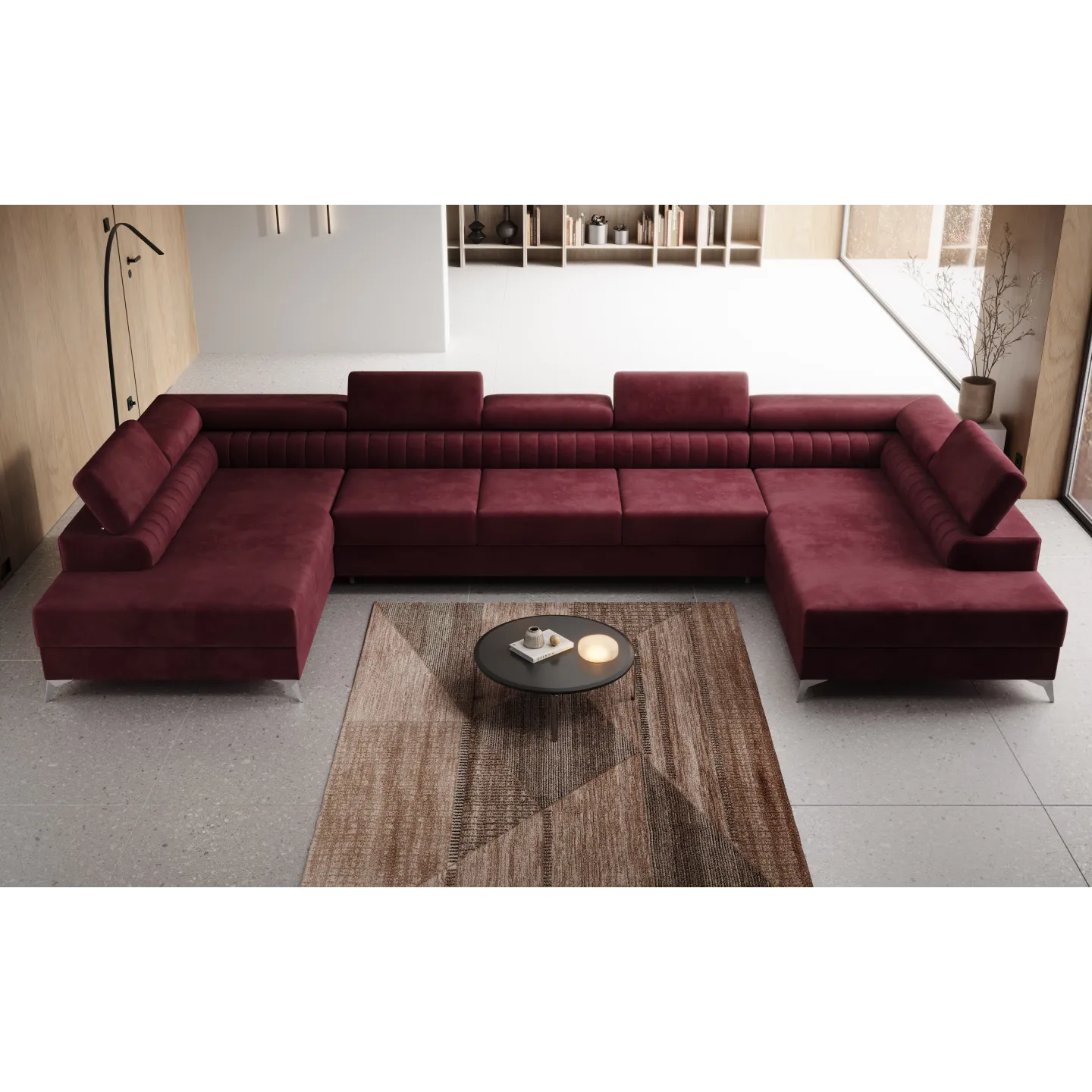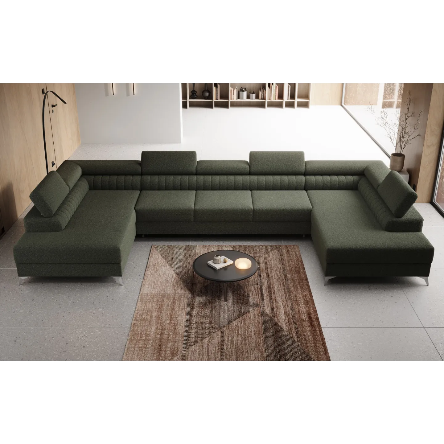 Das Schlafsofa FERMO mit Bettkasten U-Form präsentiert sich als symmetrische Wohnlandschaft: Links eine großzügige Ottomane, rechts ein verlängerter Longchair, dazwischen ein langes, mehrsitziges Polstersegment. Die Rückenlehne ist mit einer markanten Steppung versehen, die den hochwertigen Charakter der Polsterung betont und dem Sofa einen modernen, strukturierten Look verleiht.