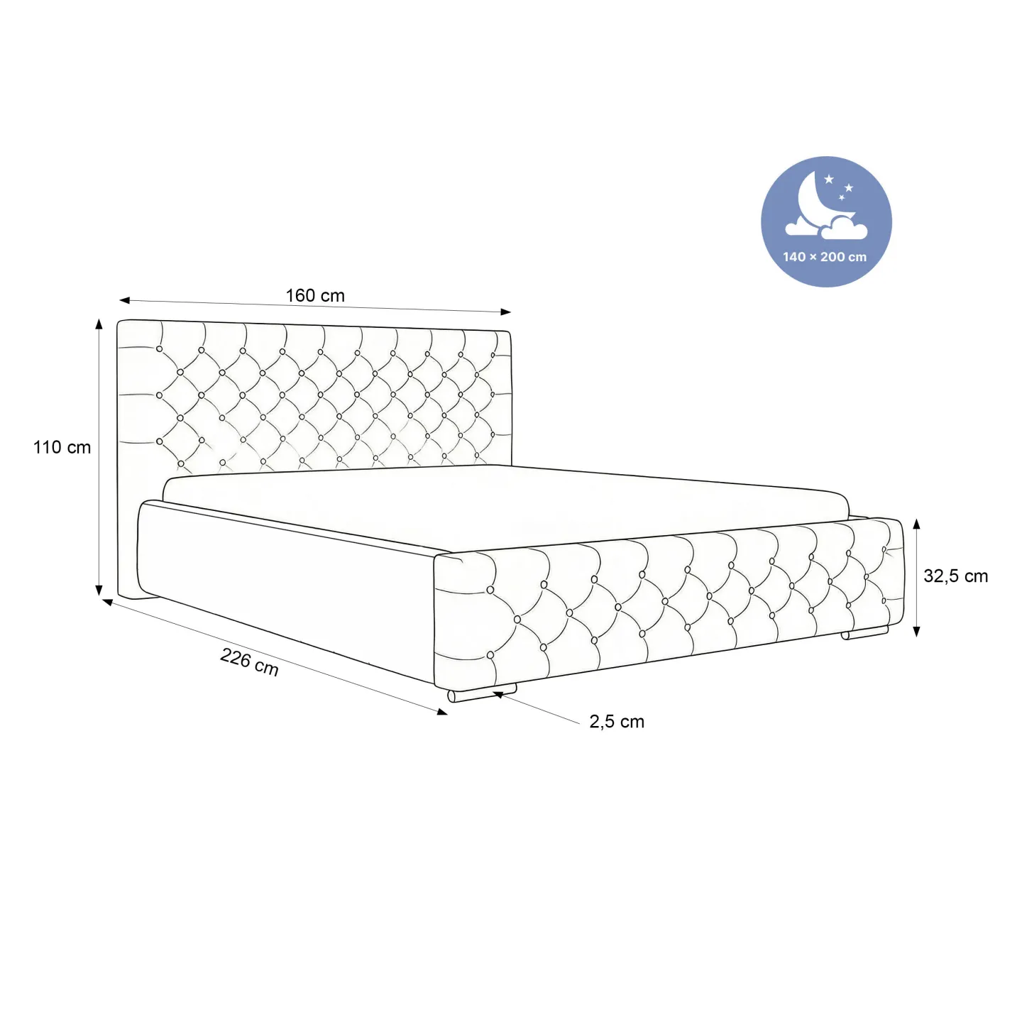 Kopfteil und Front sind mit einer 5 cm starken Schaumschicht gepolstert, was das Anlehnen beim Lesen oder Fernsehen im Bett besonders angenehm macht. Die markante Chesterfield-Steppung mit stoffbezogenen Knöpfen verleiht dem Bett seinen luxuriösen Charakter.