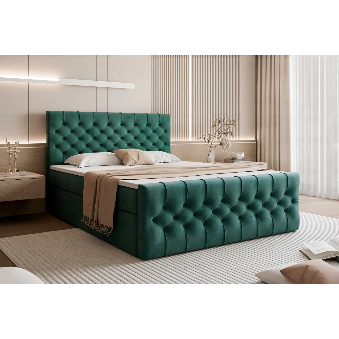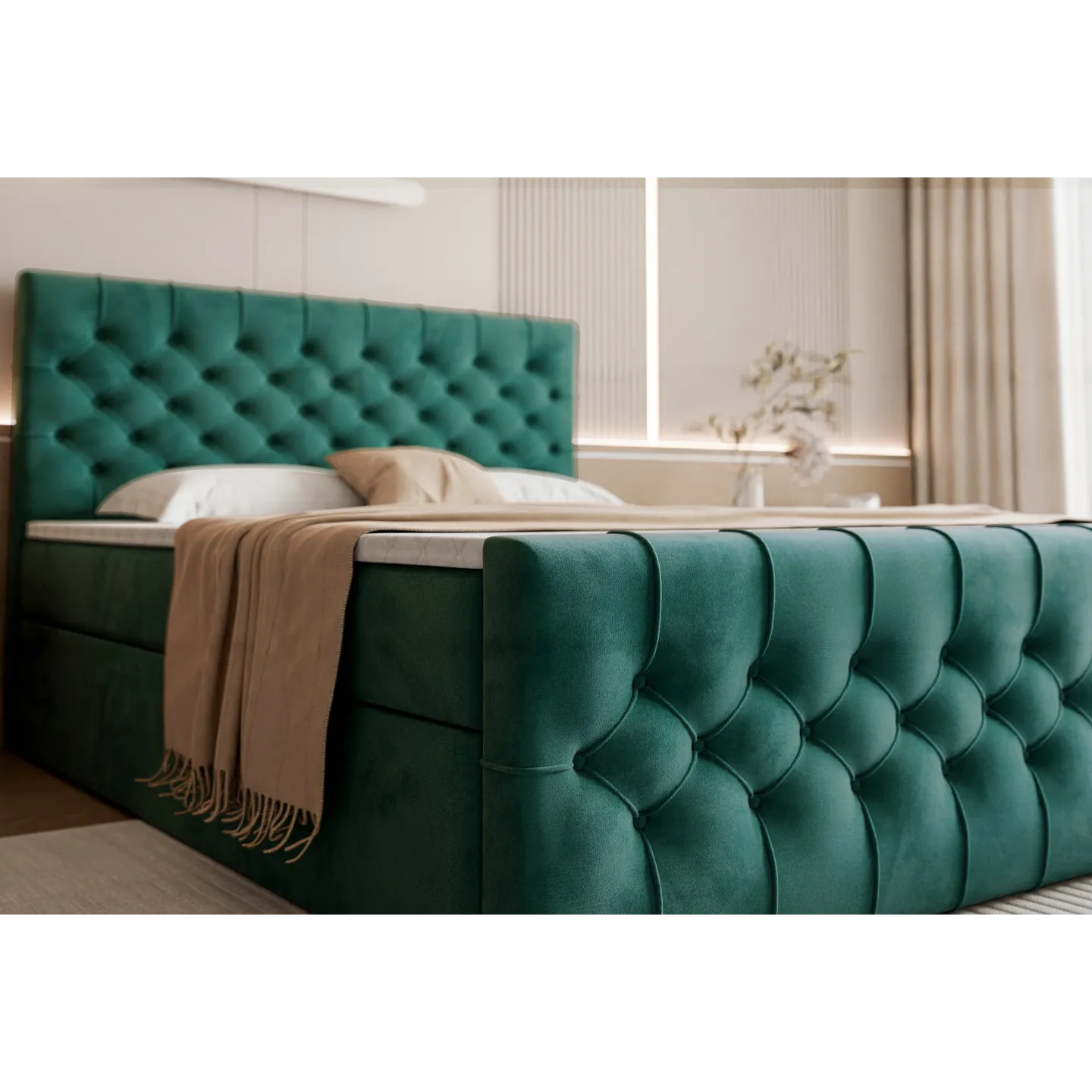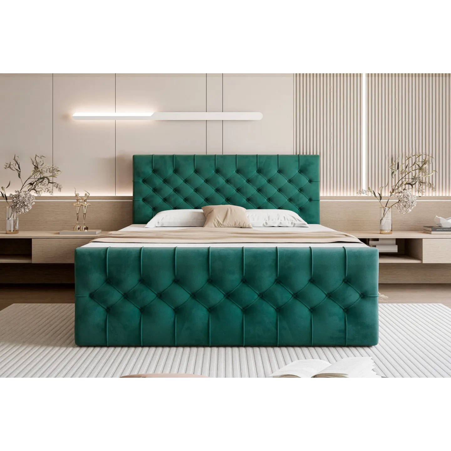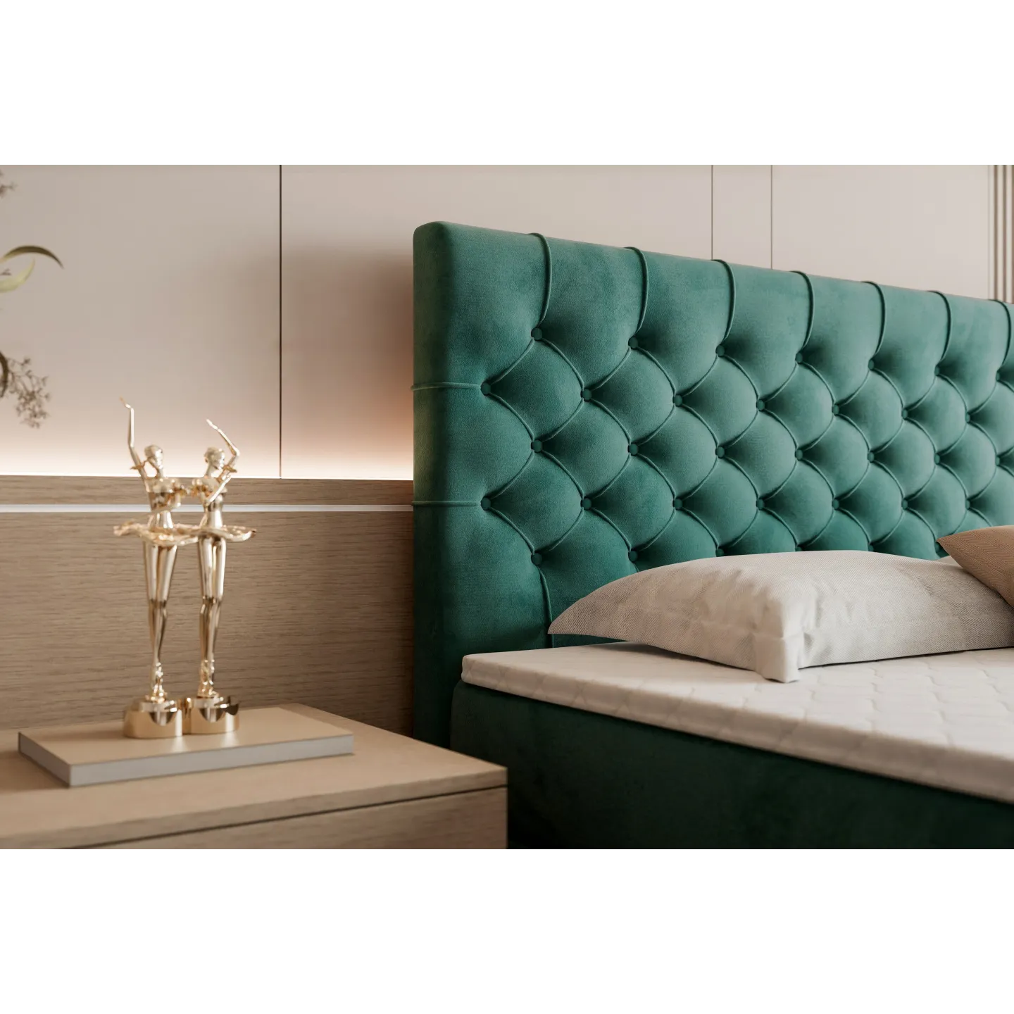 Das hohe, edel gesteppten Kopfteil im Chesterfield-Stil wird zum Blickfang deines Schlafzimmers – perfekt in Kombination mit warmen Beige-Tönen, Holz und gemütlicher Beleuchtung.