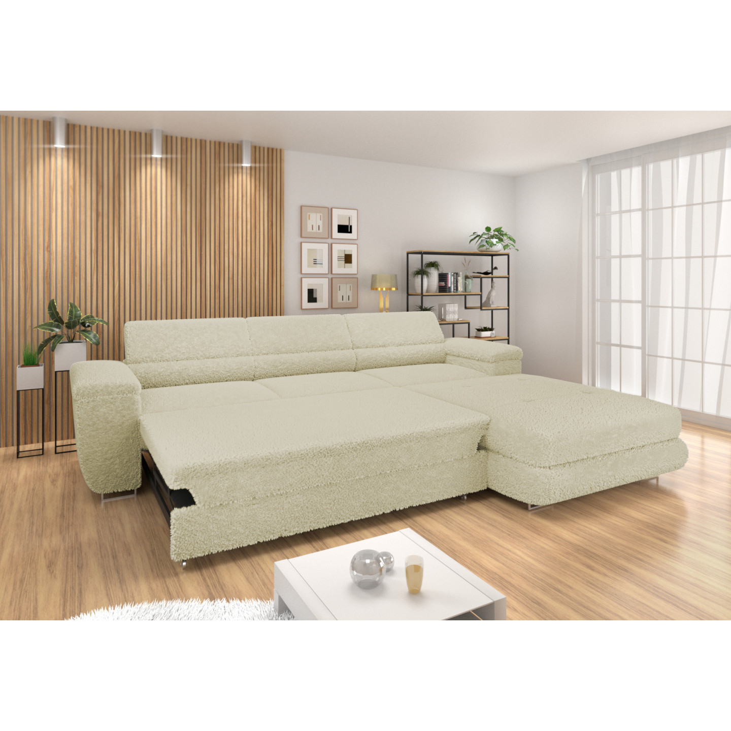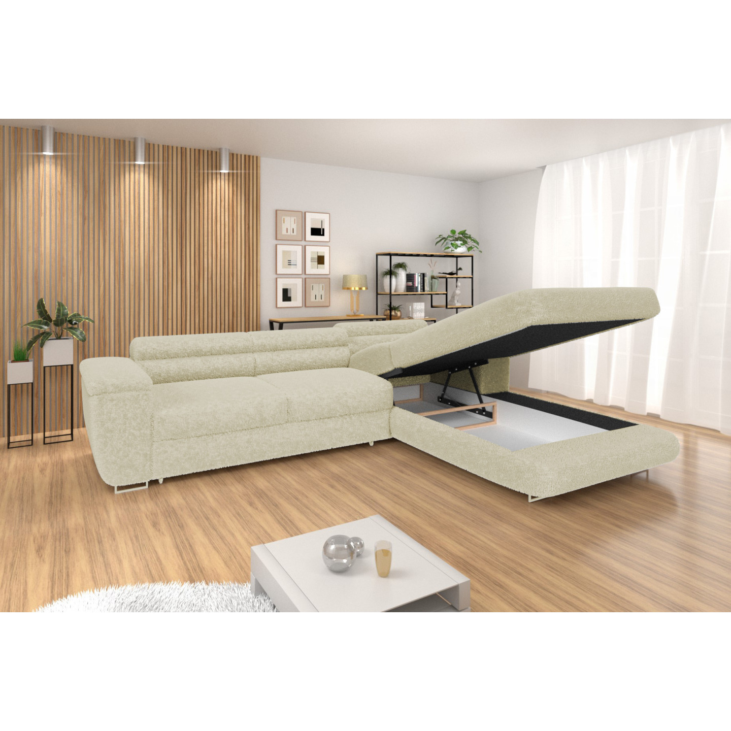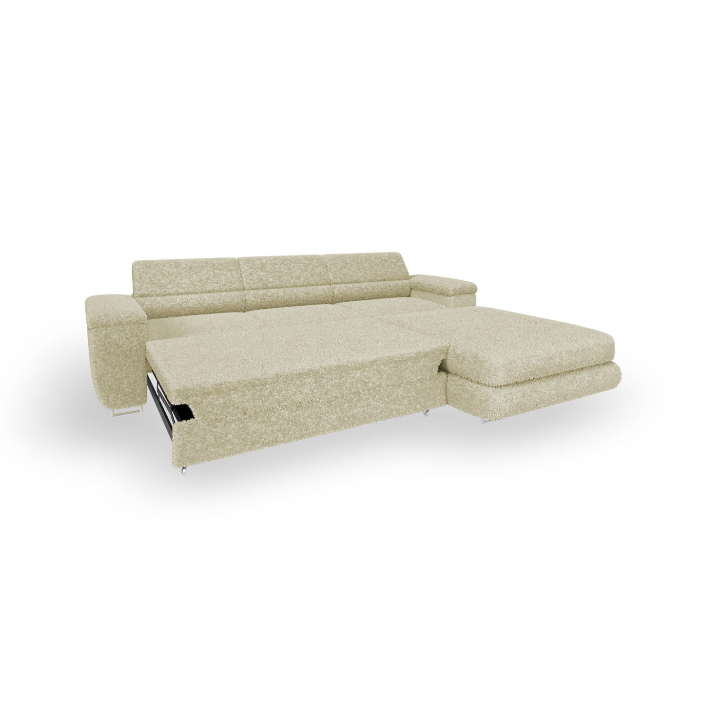 Erleben Sie höchsten Komfort und modernes Design mit dem Ecksofa VENUS BONJOUR. Dieses stilvolle Sofa mit hochwertigem Bouclé-Stoff in Beige vereint Funktionalität und Ästhetik. Dank der Schlaffunktion, des integrierten Bettkastens und der verstellbaren Kopfstützen bietet es maximalen Komfort für entspannte Abende und spontane Übernachtungsgäste.