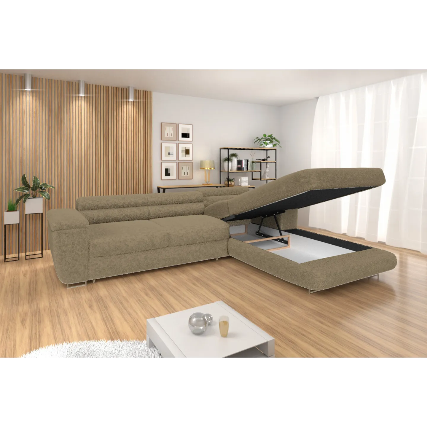 Erleben Sie höchsten Komfort und modernes Design mit dem Ecksofa VENUS BONJOUR. Dieses stilvolle Sofa mit hochwertigem Bouclé-Stoff in Beige vereint Funktionalität und Ästhetik. Dank der Schlaffunktion, des integrierten Bettkastens und der verstellbaren Kopfstützen bietet es maximalen Komfort für entspannte Abende und spontane Übernachtungsgäste.