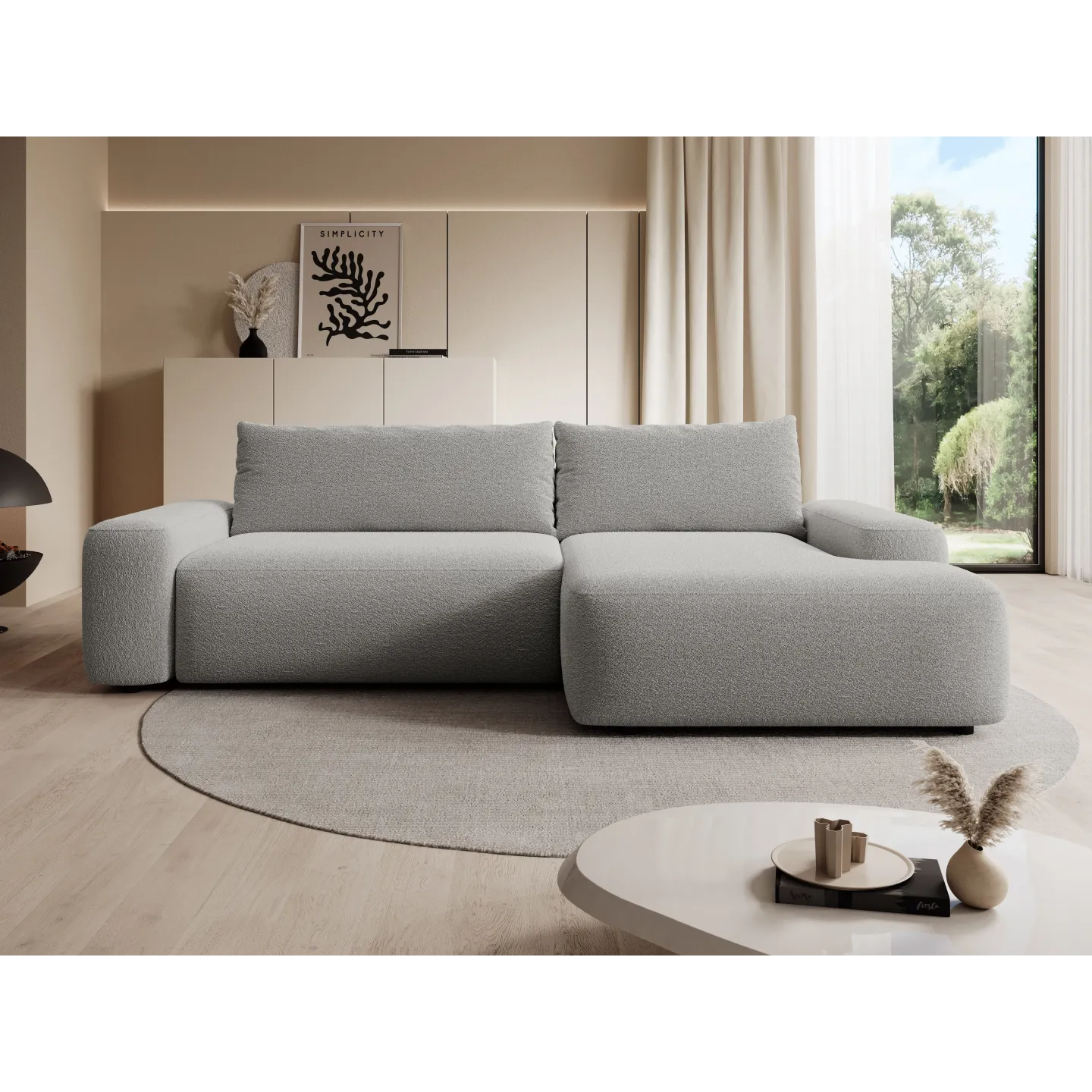Einführung Das Ecksofa POOL Beige mit Schlaffunktion und Bettkasten, Modern L-Form ist ein modernes, minimalistisches ecksofa mit schlaffunktion, das elegantes Design, hohen Sitzkomfort und praktischen Stauraum in einem Möbelstück vereint. Der beige Bouclé-Bezug Lambi sorgt für eine gemütliche Atmosphäre, während die L-Form optimal Platz im Wohnzimmer nutzt – in kleinen wie in großen Räumen.