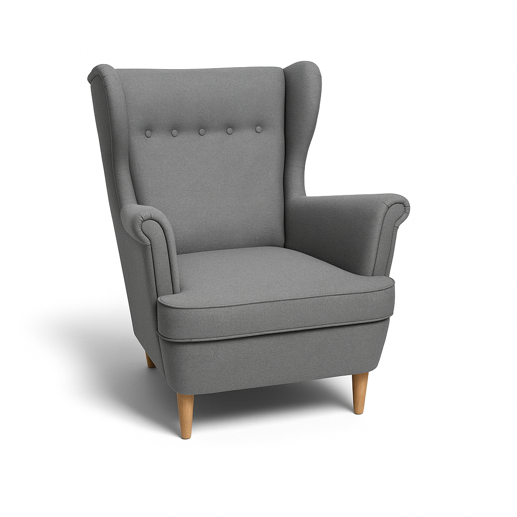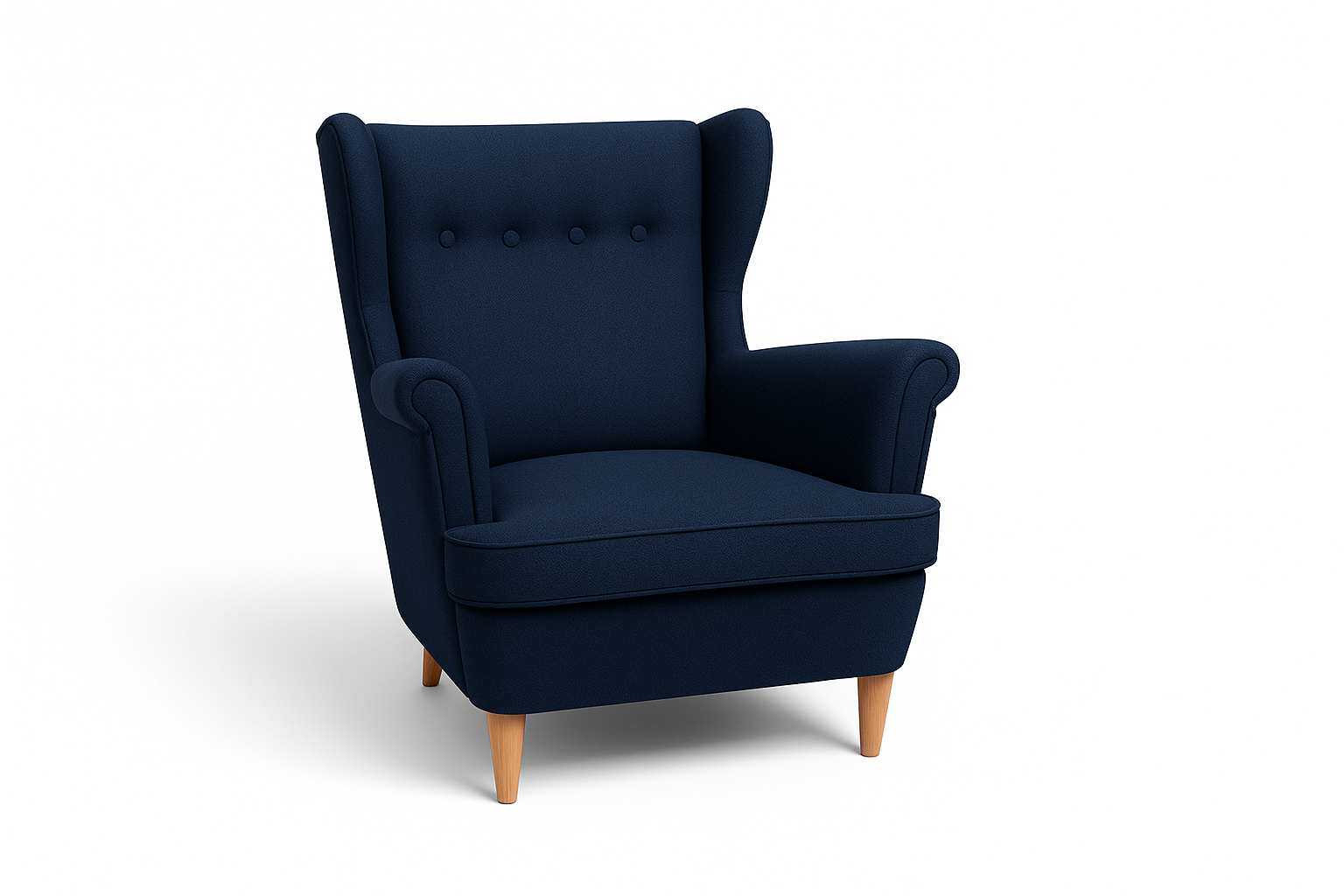Skandinavischer Ohrensessel mit weichen Polstern, dekorativer Knopfheftung und abnehmbarem Zierkissen. Perfekt für Wohnzimmer, Home-Office oder Leseecke.