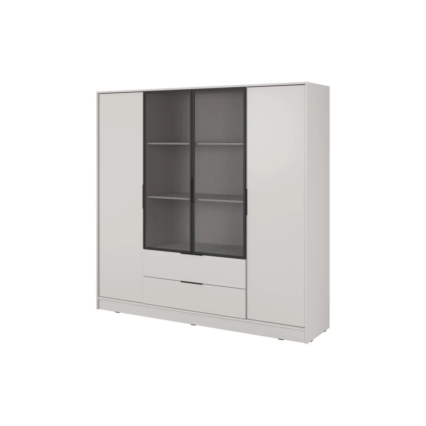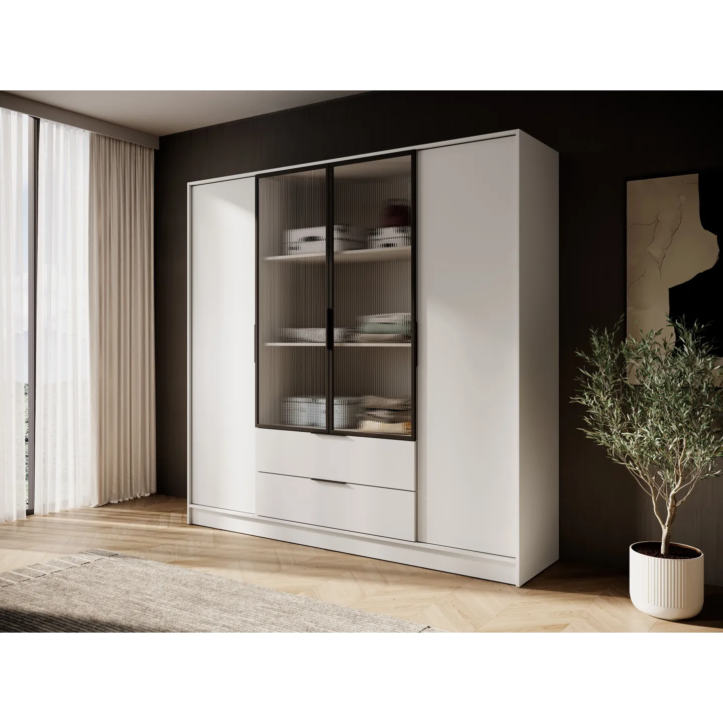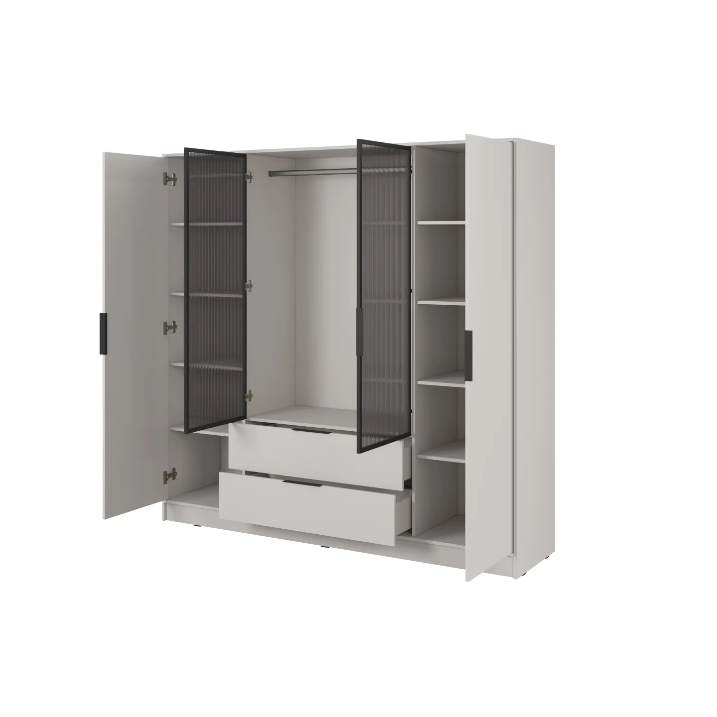 Der Kleiderschrank NADI kombiniert modernes Design mit praktischen Funktionen. Mit eleganten Glastüren, durchdachtem Regalsystem und langlebigen Materialien ist er die perfekte Wahl für jeden, der Ordnung und Stil in sein Zuhause bringen möchte.