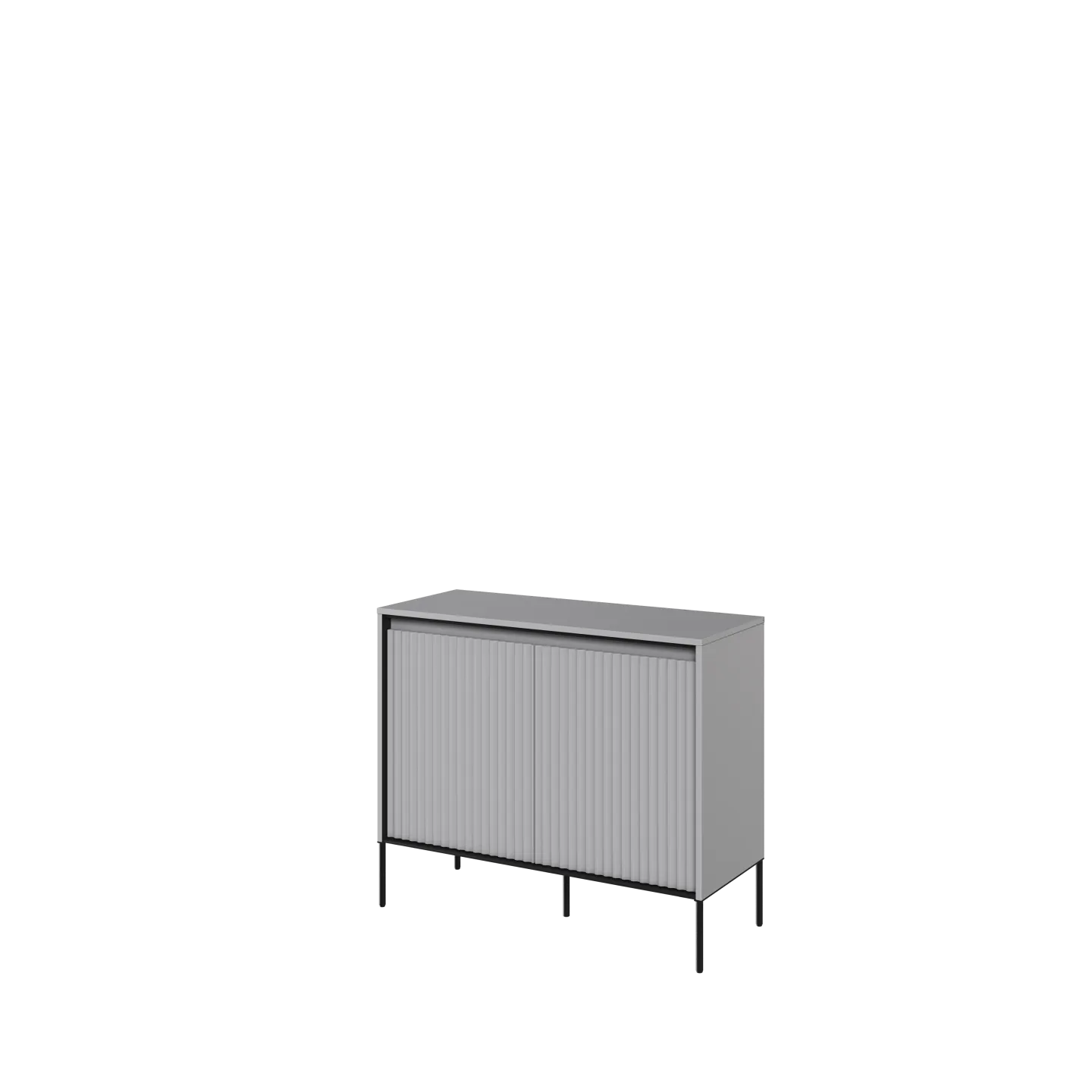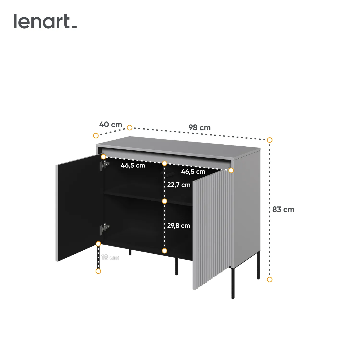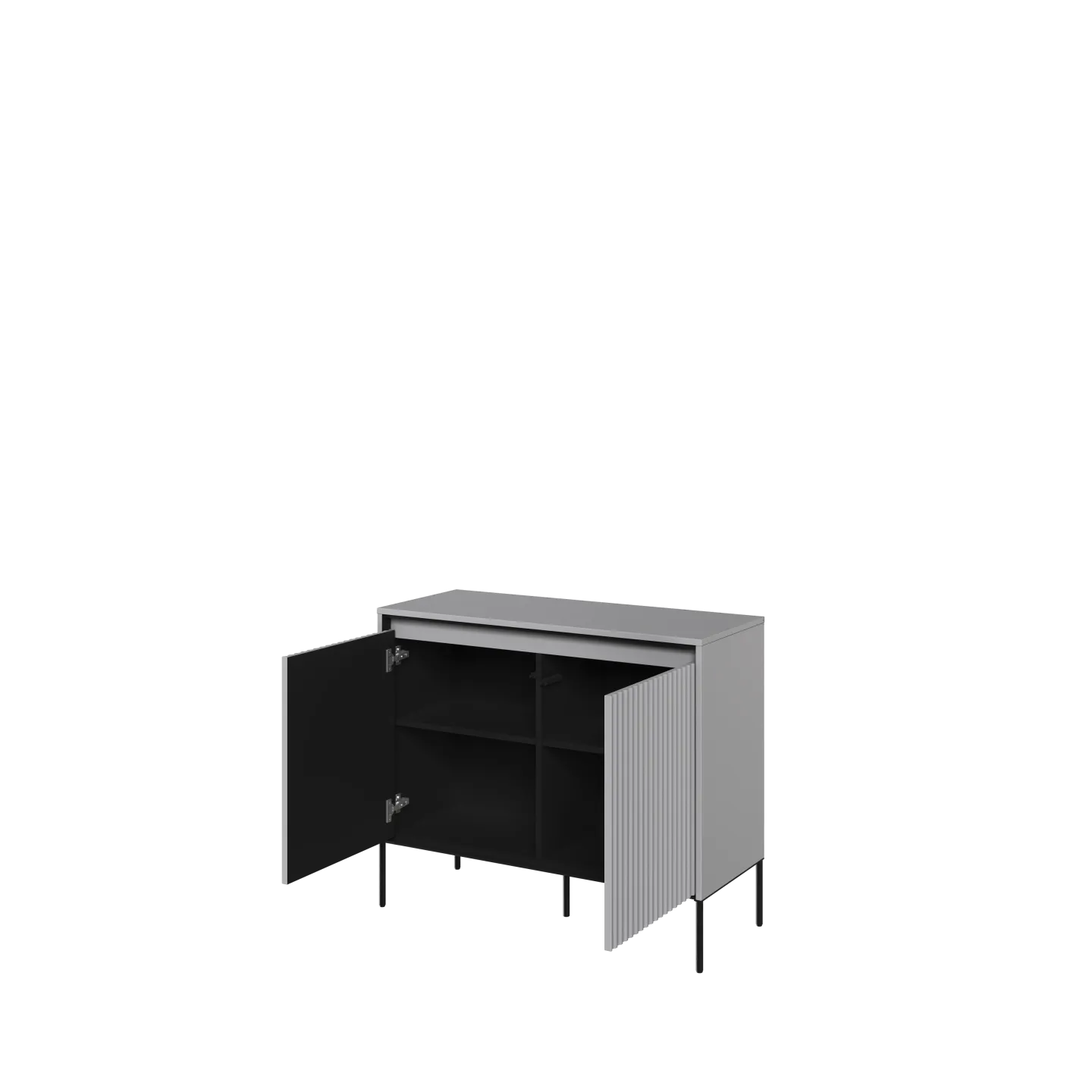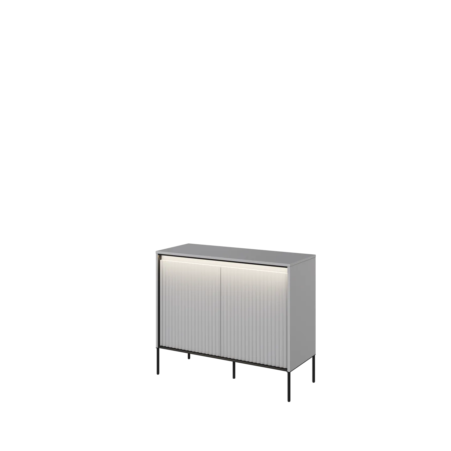 Die zweitürige Kommode ist speziell für schmale Räume konzipiert. Ihre integrierte LED-Beleuchtung setzt sanfte Akzente und sorgt für eine angenehme Atmosphäre – besonders praktisch in Fluren, die oft weniger Licht bekommen. Stabilität und ein edler Look werden durch die schwarzen Metallfüße garantiert, die zudem eine leichte Reinigung ermöglichen.
