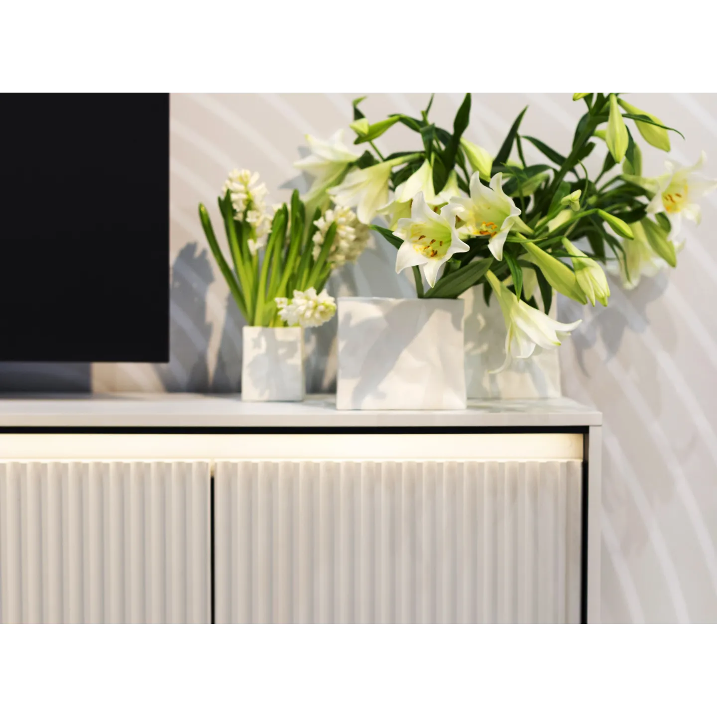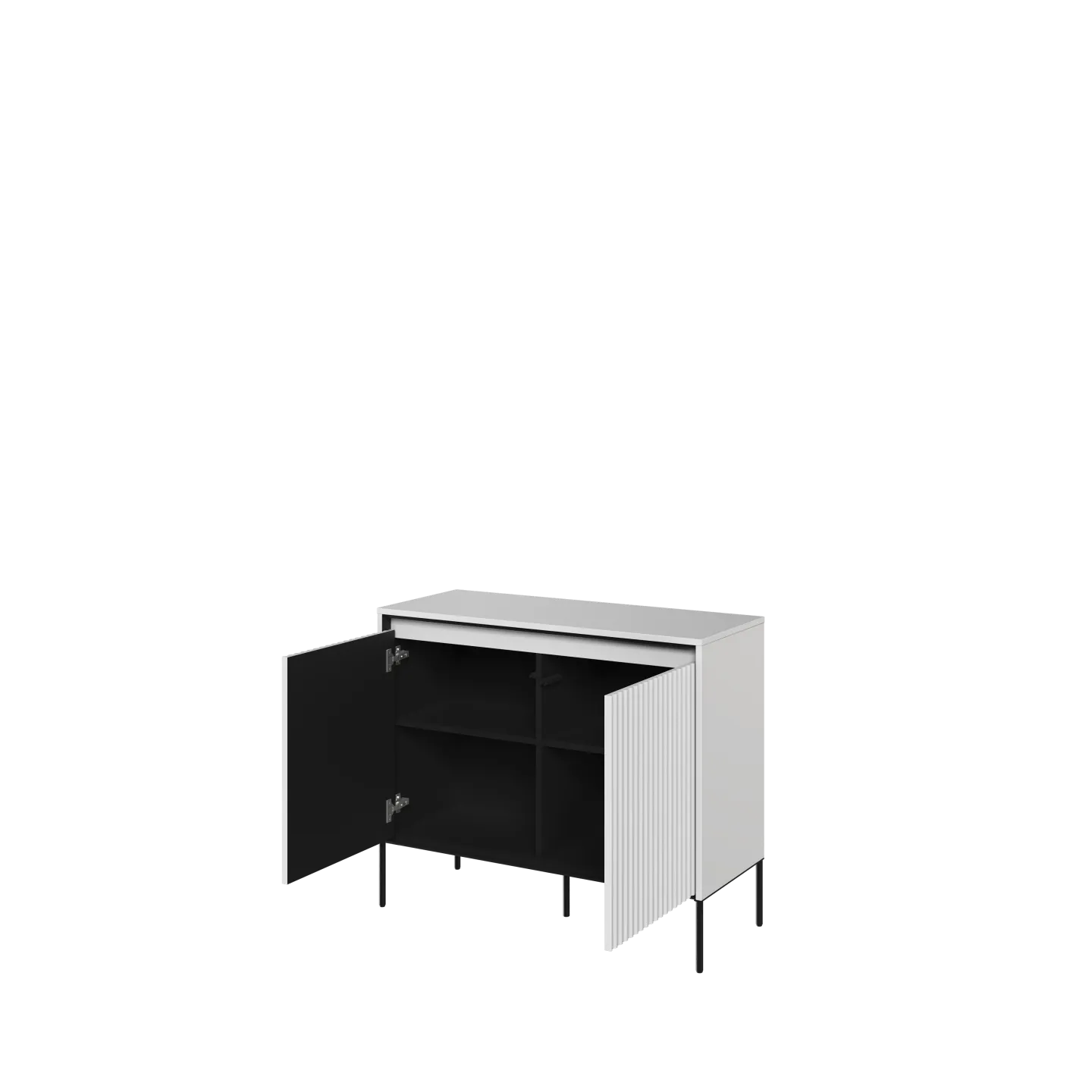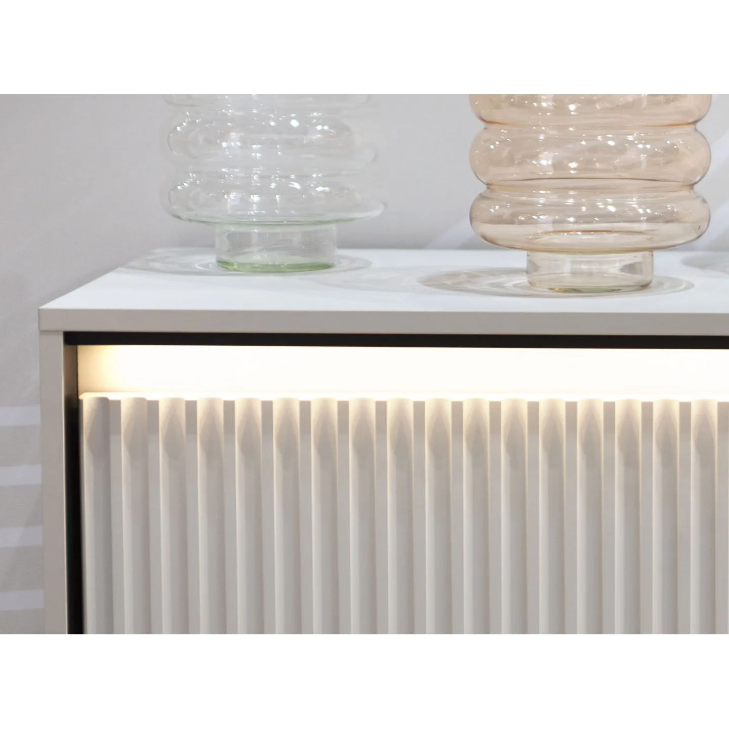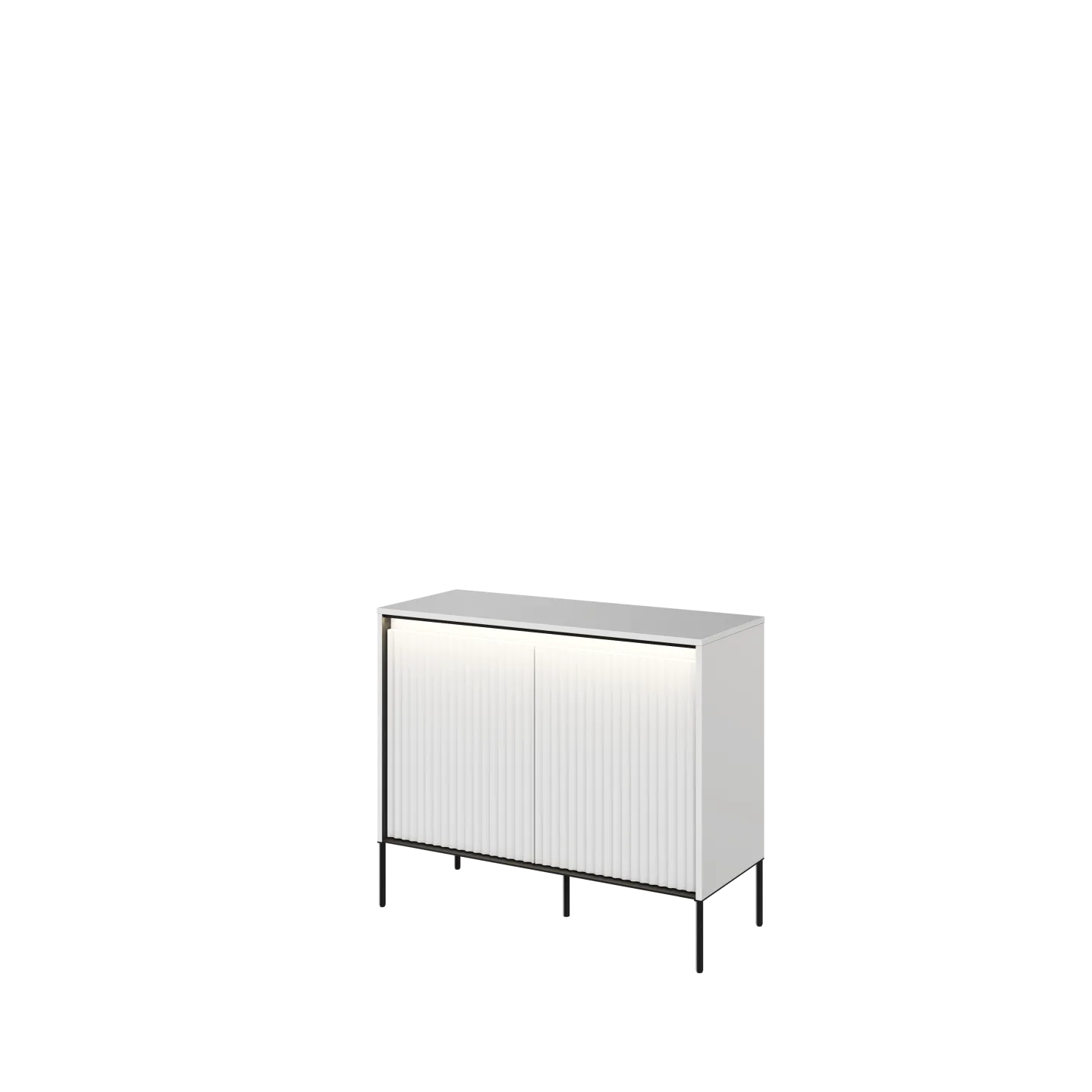 Die zweitürige Kommode ist speziell für schmale Räume konzipiert. Ihre integrierte LED-Beleuchtung setzt sanfte Akzente und sorgt für eine angenehme Atmosphäre – besonders praktisch in Fluren, die oft weniger Licht bekommen. Stabilität und ein edler Look werden durch die schwarzen Metallfüße garantiert, die zudem eine leichte Reinigung ermöglichen.
