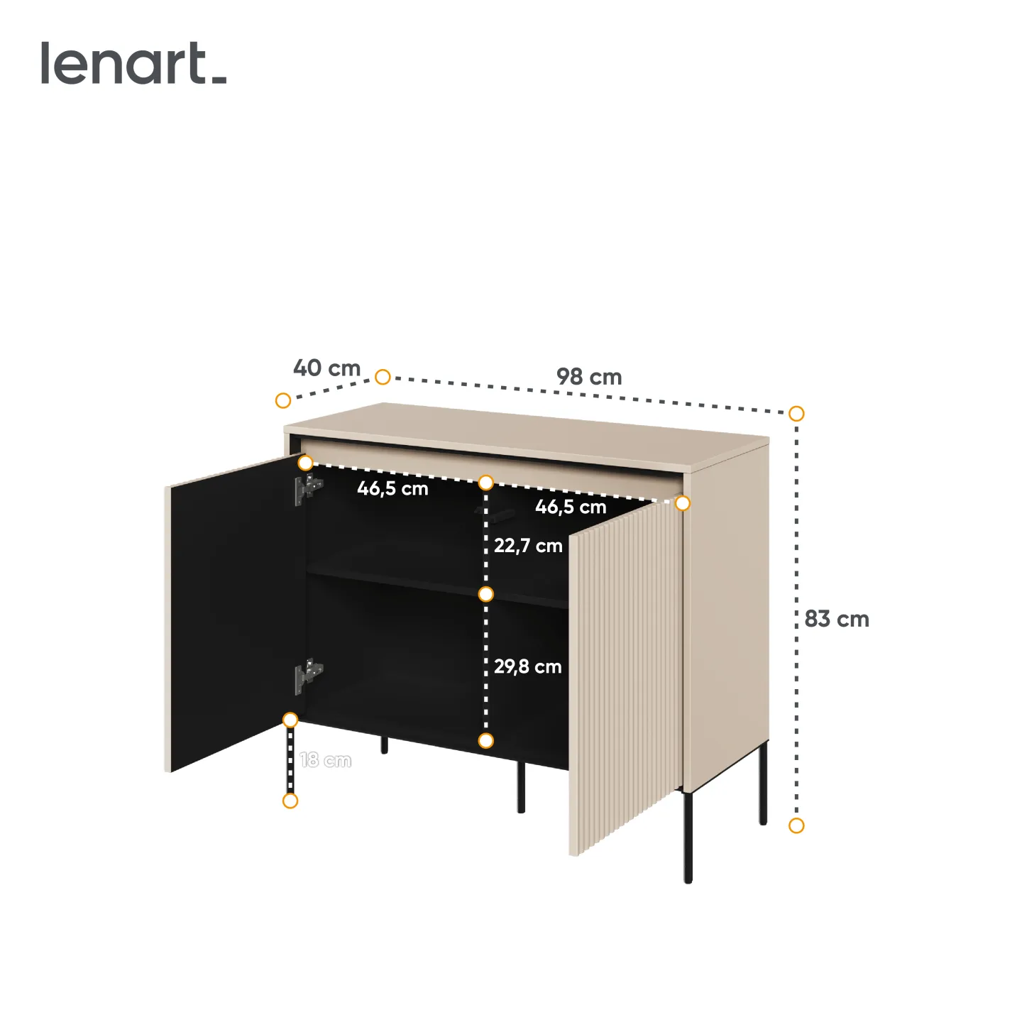 Die zweitürige Kommode ist speziell für schmale Räume konzipiert. Ihre integrierte LED-Beleuchtung setzt sanfte Akzente und sorgt für eine angenehme Atmosphäre – besonders praktisch in Fluren, die oft weniger Licht bekommen. Stabilität und ein edler Look werden durch die schwarzen Metallfüße garantiert, die zudem eine leichte Reinigung ermöglichen.