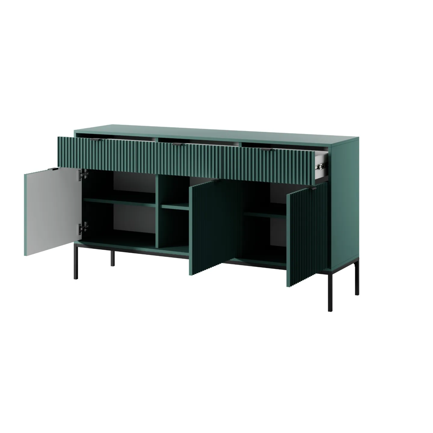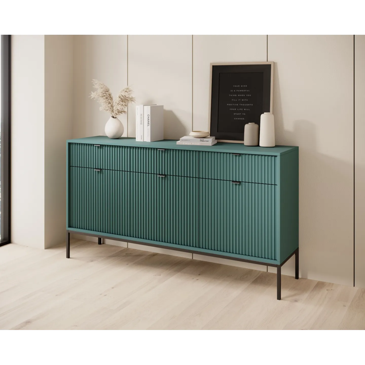 Das Visanna Sideboard kombiniert modernes Design mit hoher Funktionalität. Die dekorativen geriffelten Fronten und eleganten goldenen Griffe verleihen Ihrem Wohnraum eine stilvolle Note.