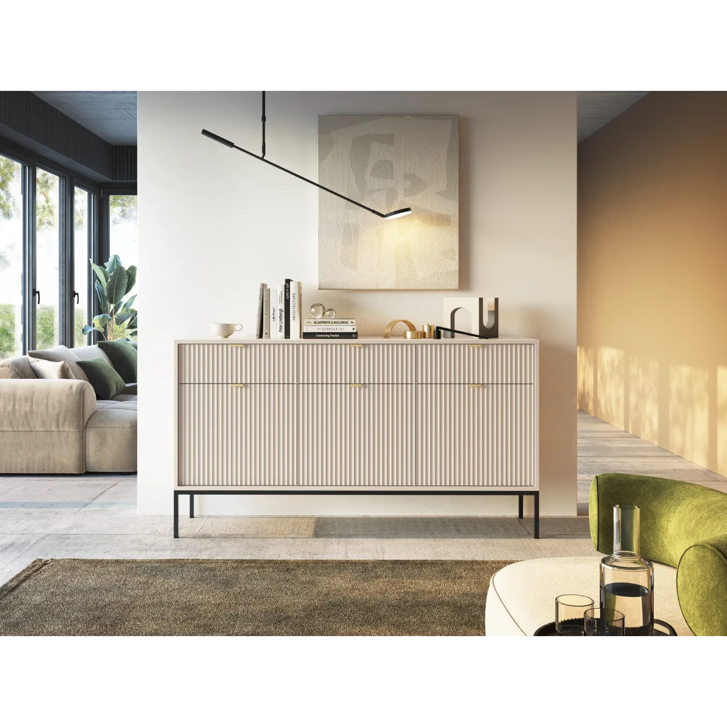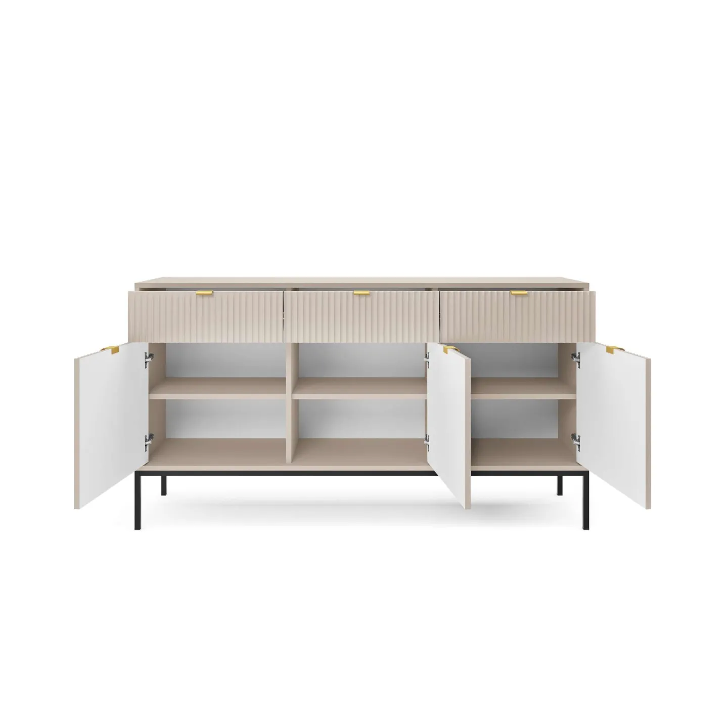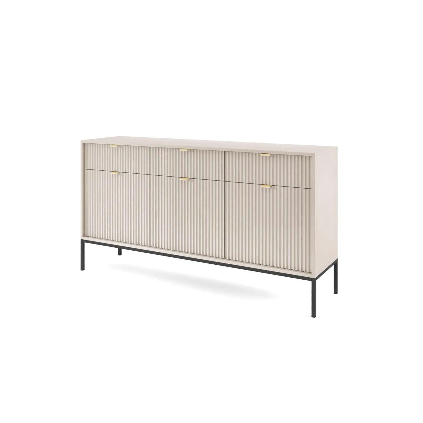 Das Visanna Sideboard kombiniert modernes Design mit hoher Funktionalität. Die dekorativen geriffelten Fronten und eleganten goldenen Griffe verleihen Ihrem Wohnraum eine stilvolle Note.