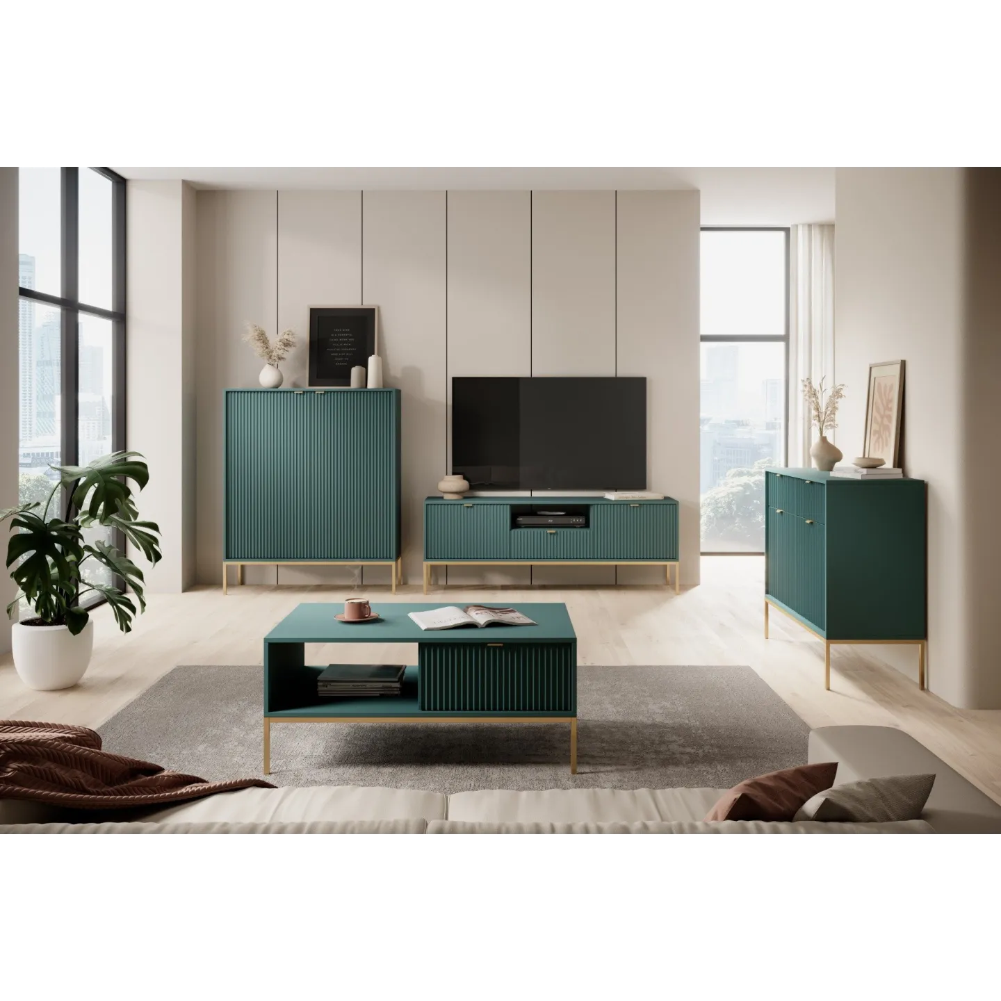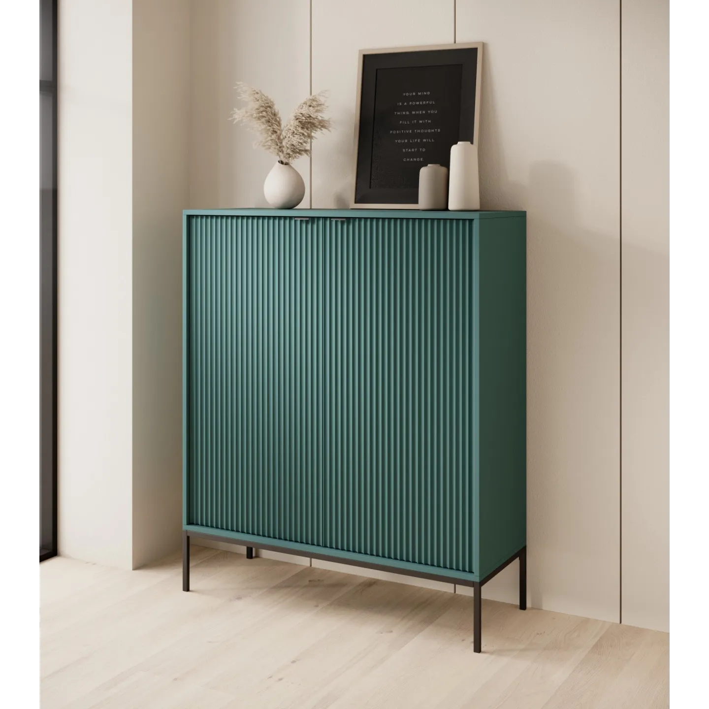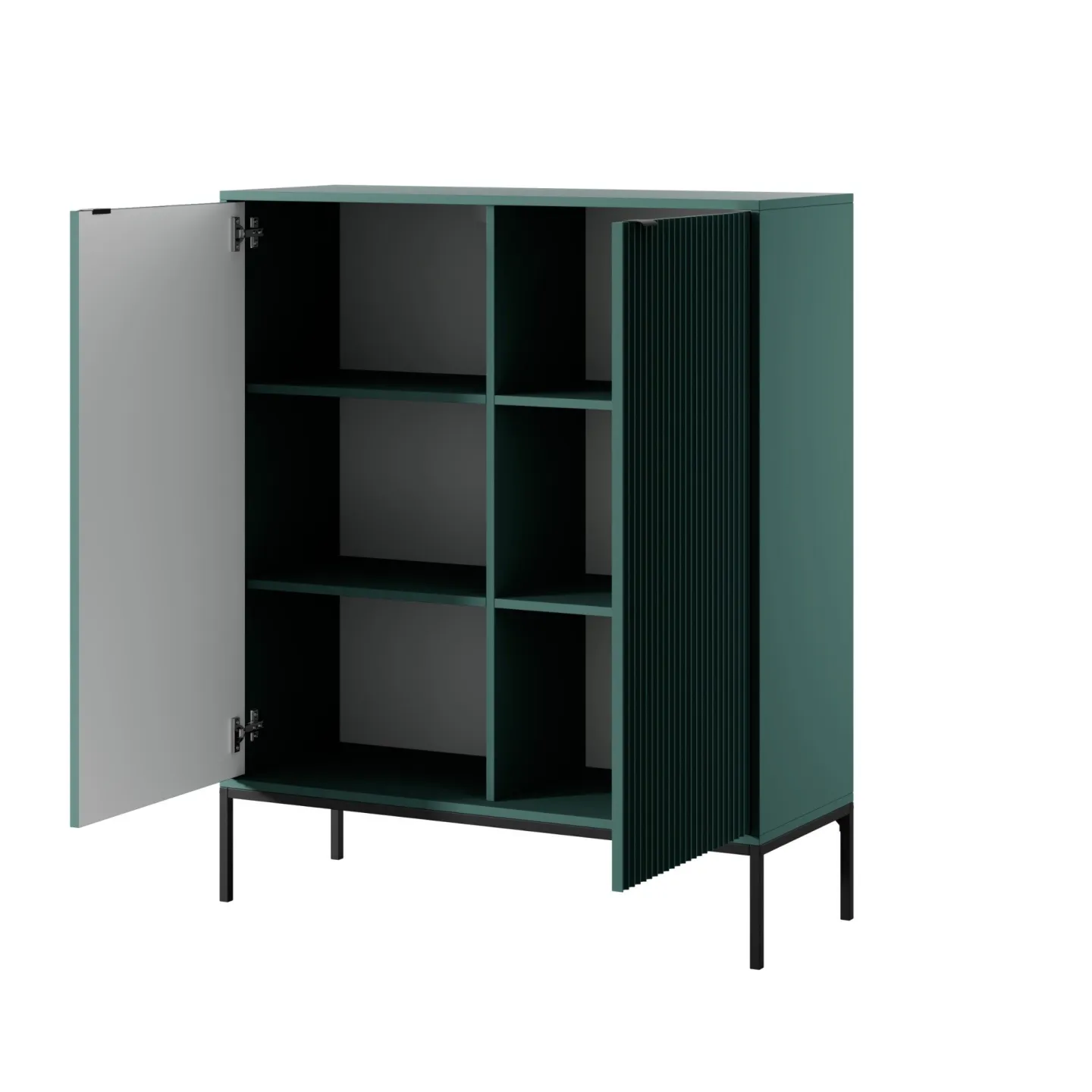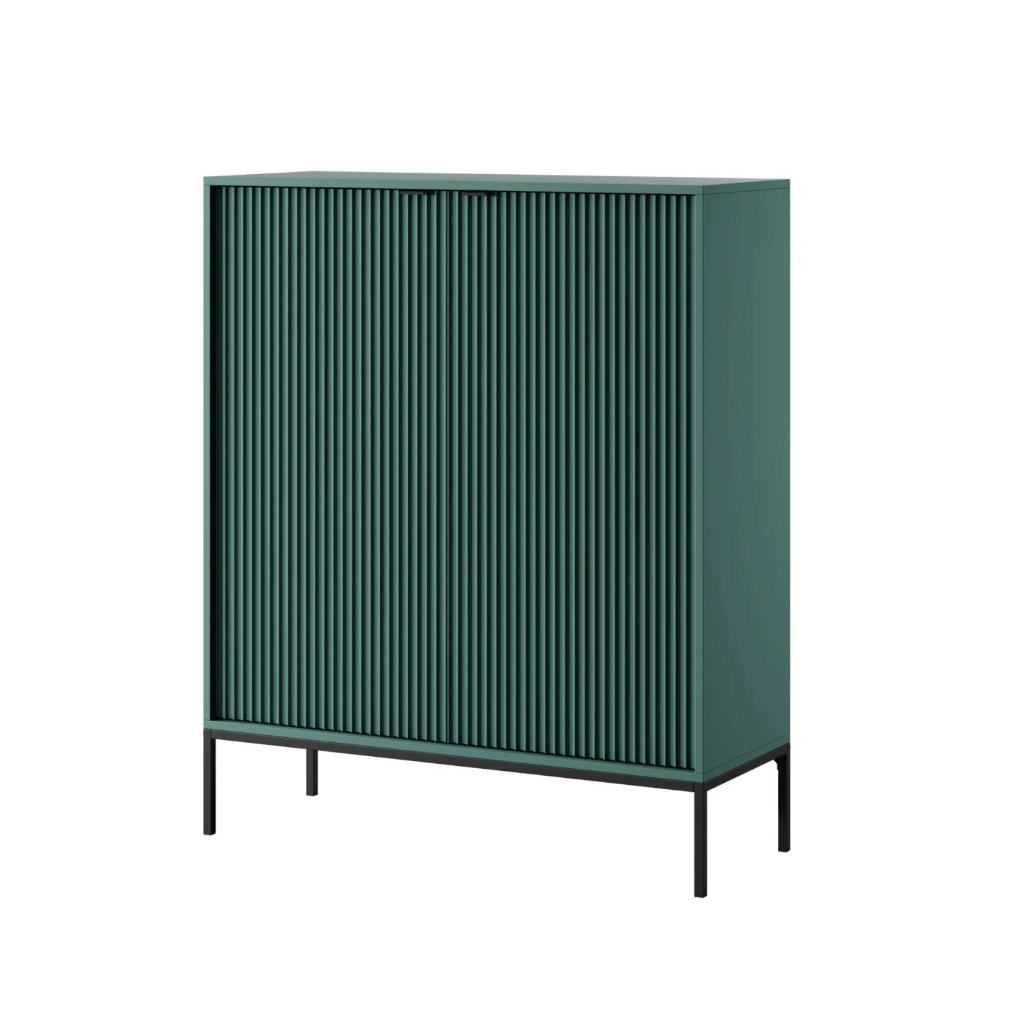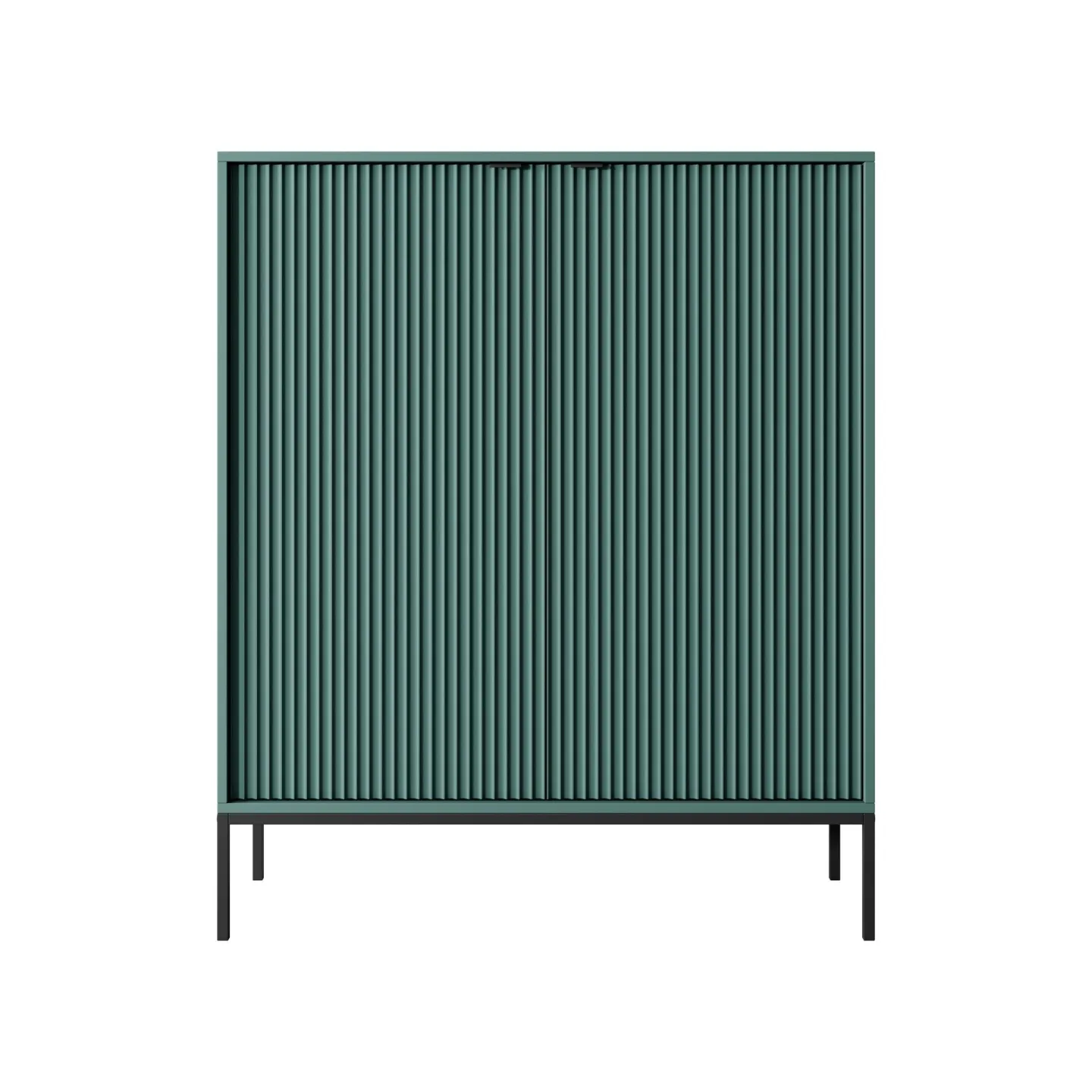 Erhältlich in 5 Farben mit zwei Beinvarianten. Die Kombination aus goldenen Griffen und geriffelten Fronten verleiht dem Möbelstück Eleganz und einen einzigartigen Charakter.