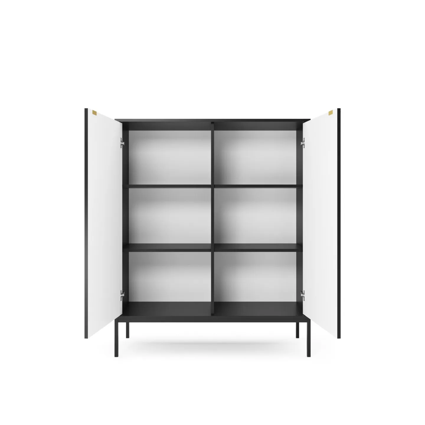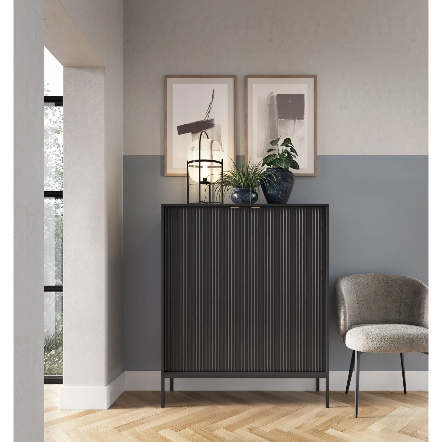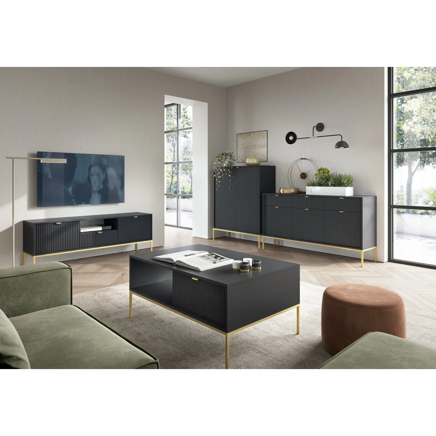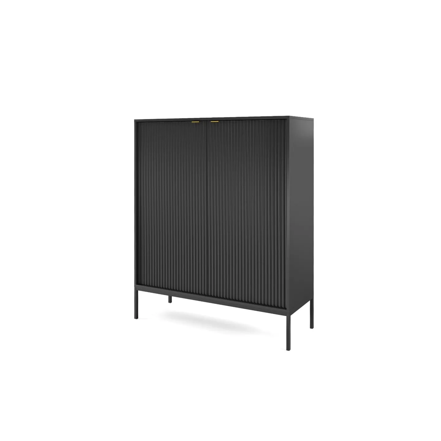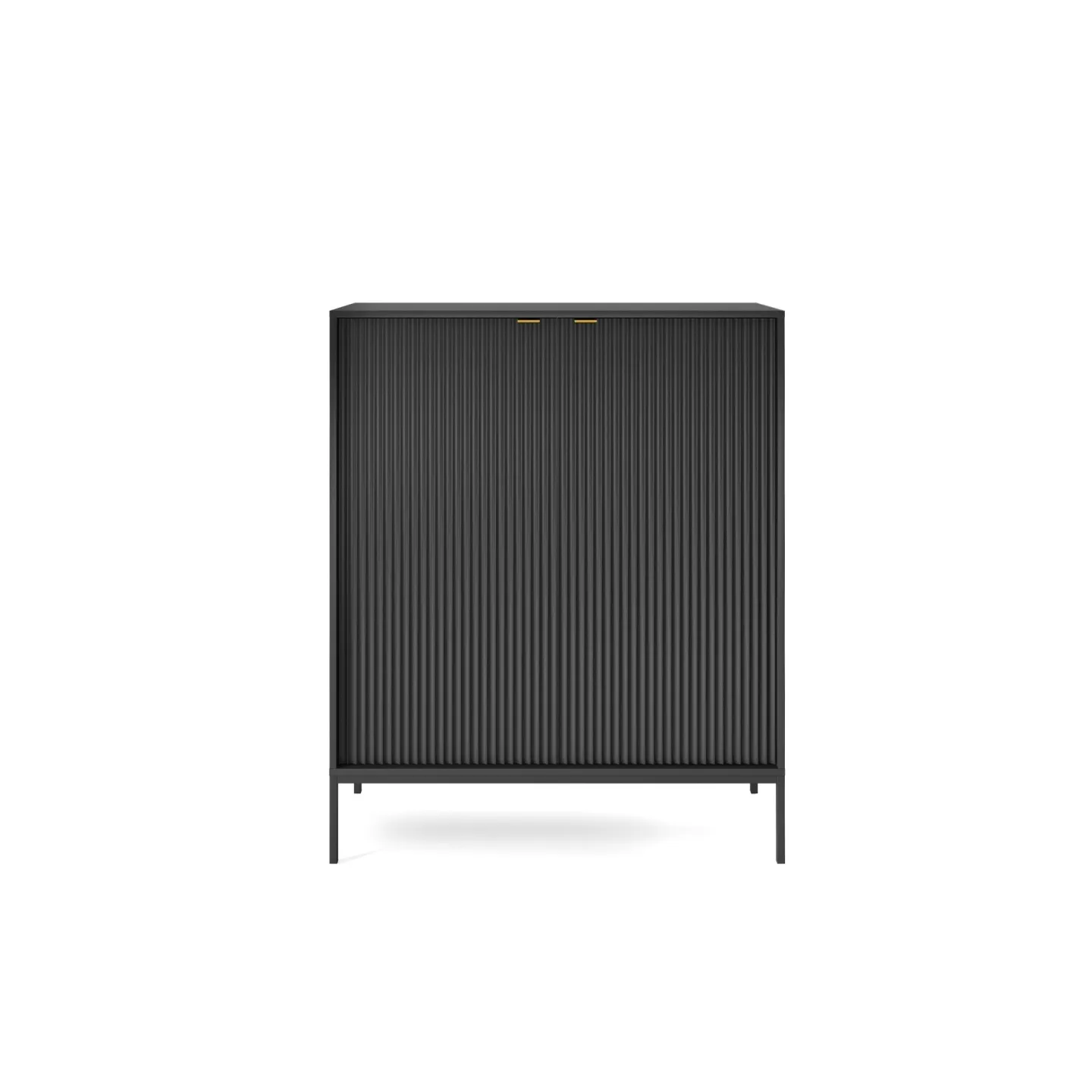 Erhältlich in 5 Farben mit zwei Beinvarianten. Die Kombination aus goldenen Griffen und geriffelten Fronten verleiht dem Möbelstück Eleganz und einen einzigartigen Charakter.