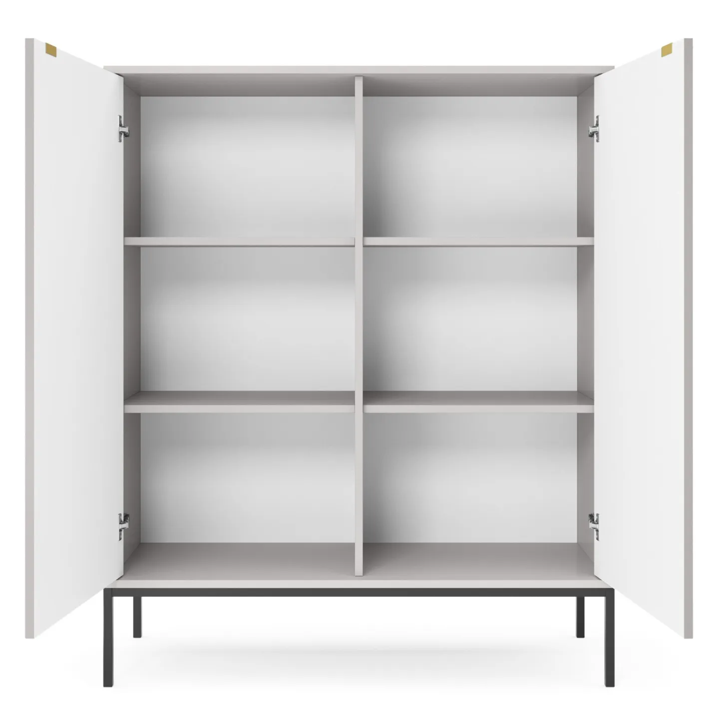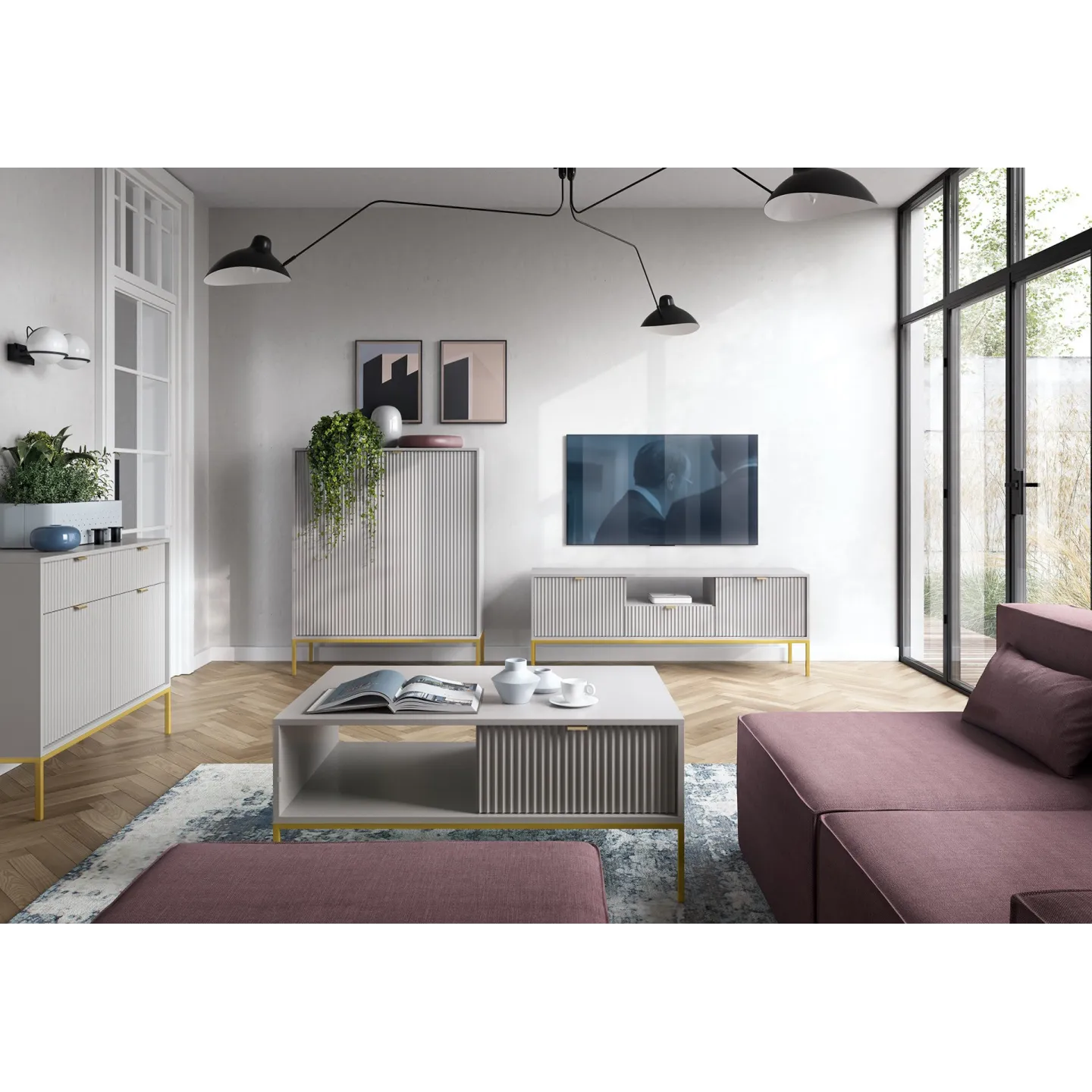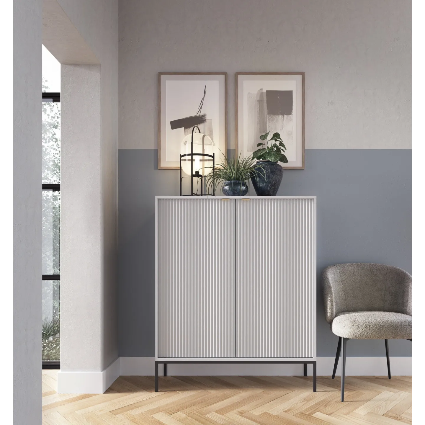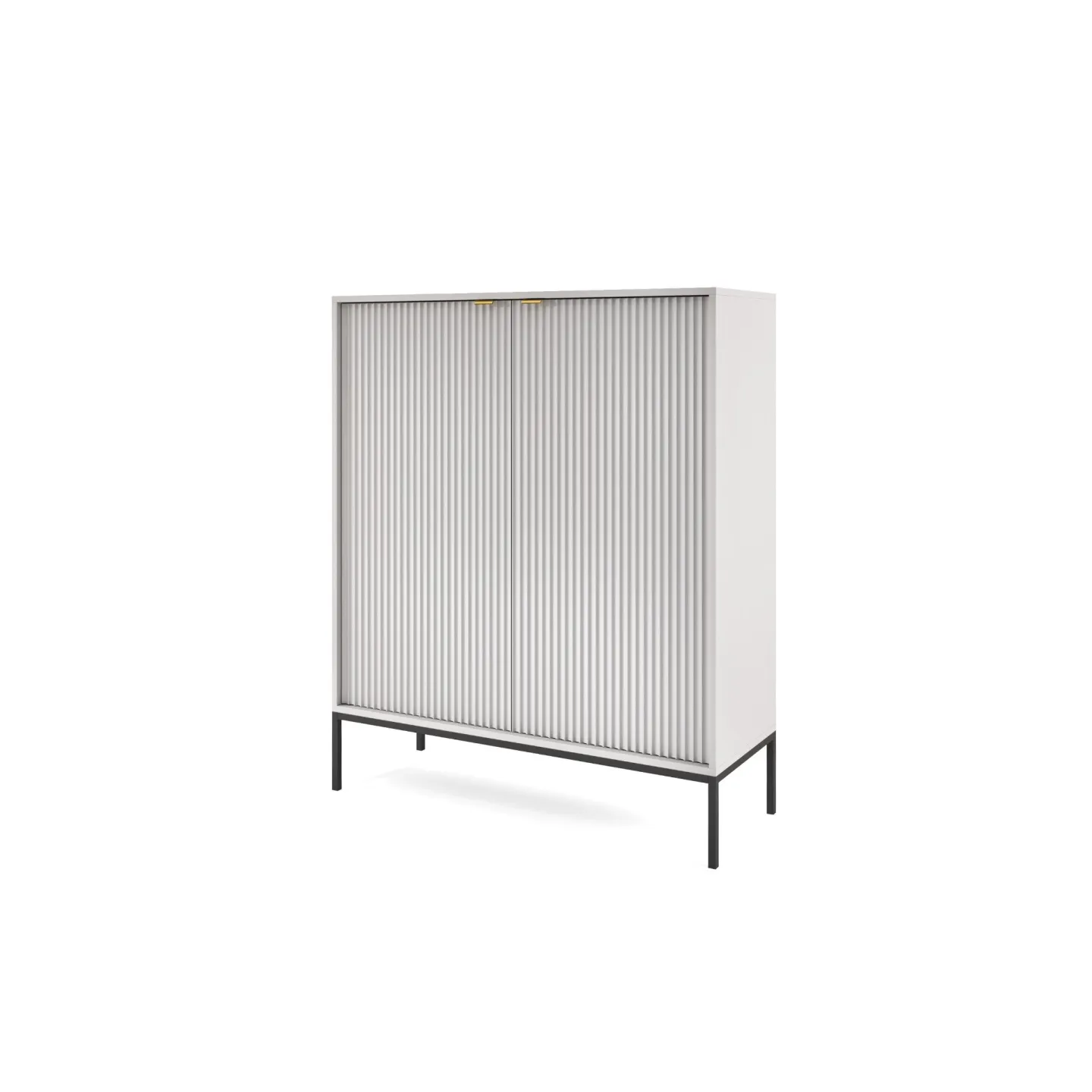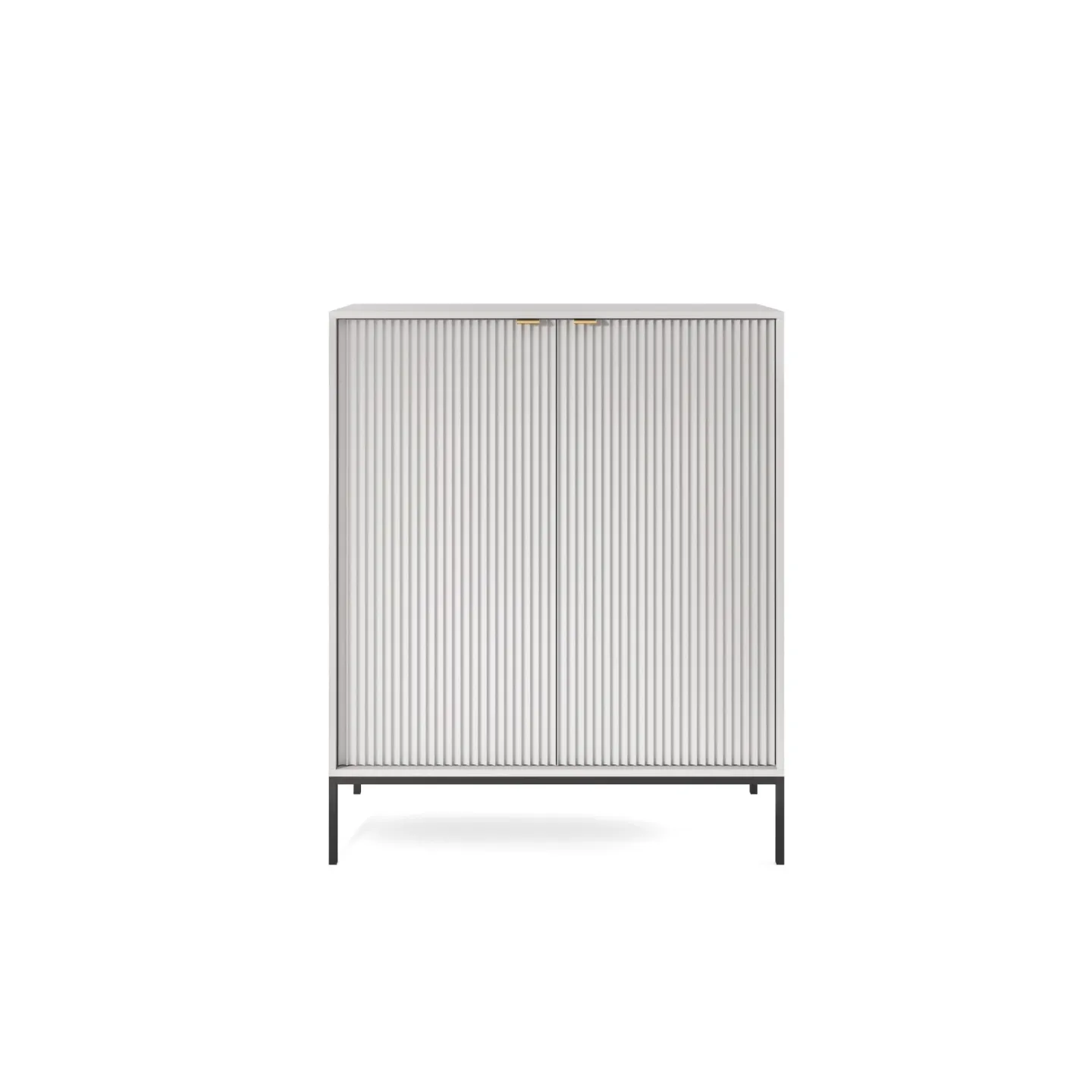 Erhältlich in 5 Farben mit zwei Beinvarianten. Die Kombination aus goldenen Griffen und geriffelten Fronten verleiht dem Möbelstück Eleganz und einen einzigartigen Charakter.