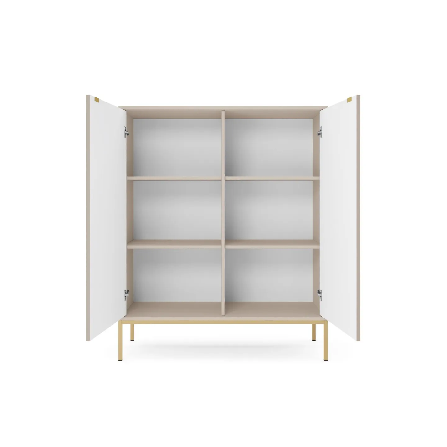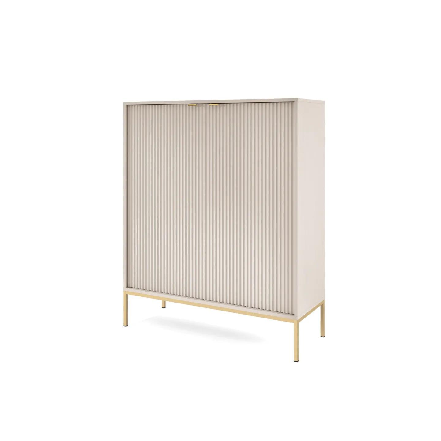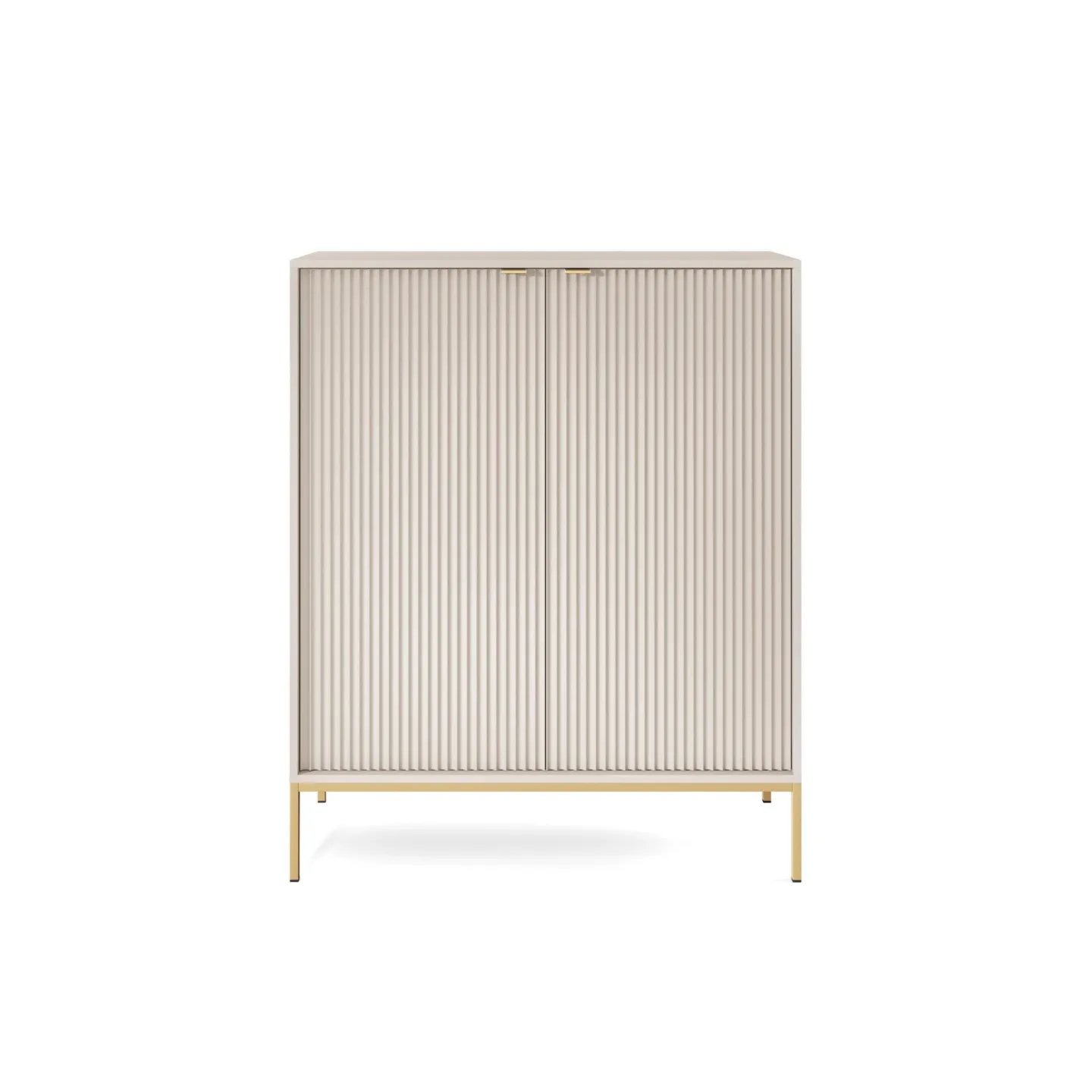 Erhältlich in 5 Farben mit zwei Beinvarianten. Die Kombination aus goldenen Griffen und geriffelten Fronten verleiht dem Möbelstück Eleganz und einen einzigartigen Charakter.