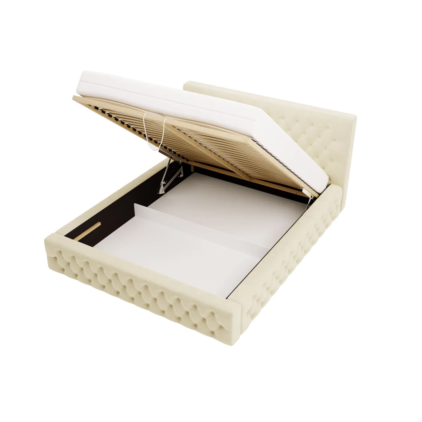 Das Chester Polsterbett vereint zeitlose Eleganz mit modernen Funktionen. Mit seinem edlen Chesterfield-Design, hochwertigen Materialien und einem praktischen Bettkasten ist es die perfekte Wahl für Ihr Schlafzimmer.