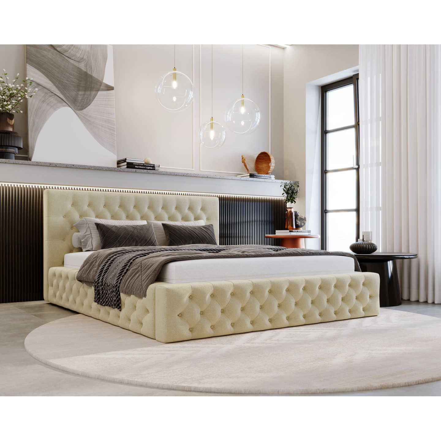 Das Chester Polsterbett vereint zeitlose Eleganz mit modernen Funktionen. Mit seinem edlen Chesterfield-Design, hochwertigen Materialien und einem praktischen Bettkasten ist es die perfekte Wahl für Ihr Schlafzimmer.