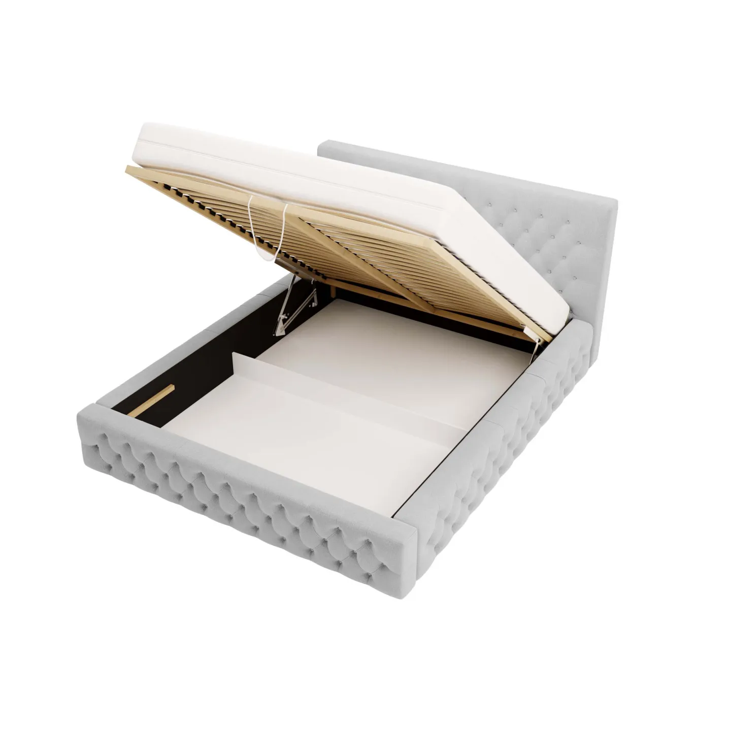 Das Chester Polsterbett vereint zeitlose Eleganz mit modernen Funktionen. Mit seinem edlen Chesterfield-Design, hochwertigen Materialien und einem praktischen Bettkasten ist es die perfekte Wahl für Ihr Schlafzimmer.