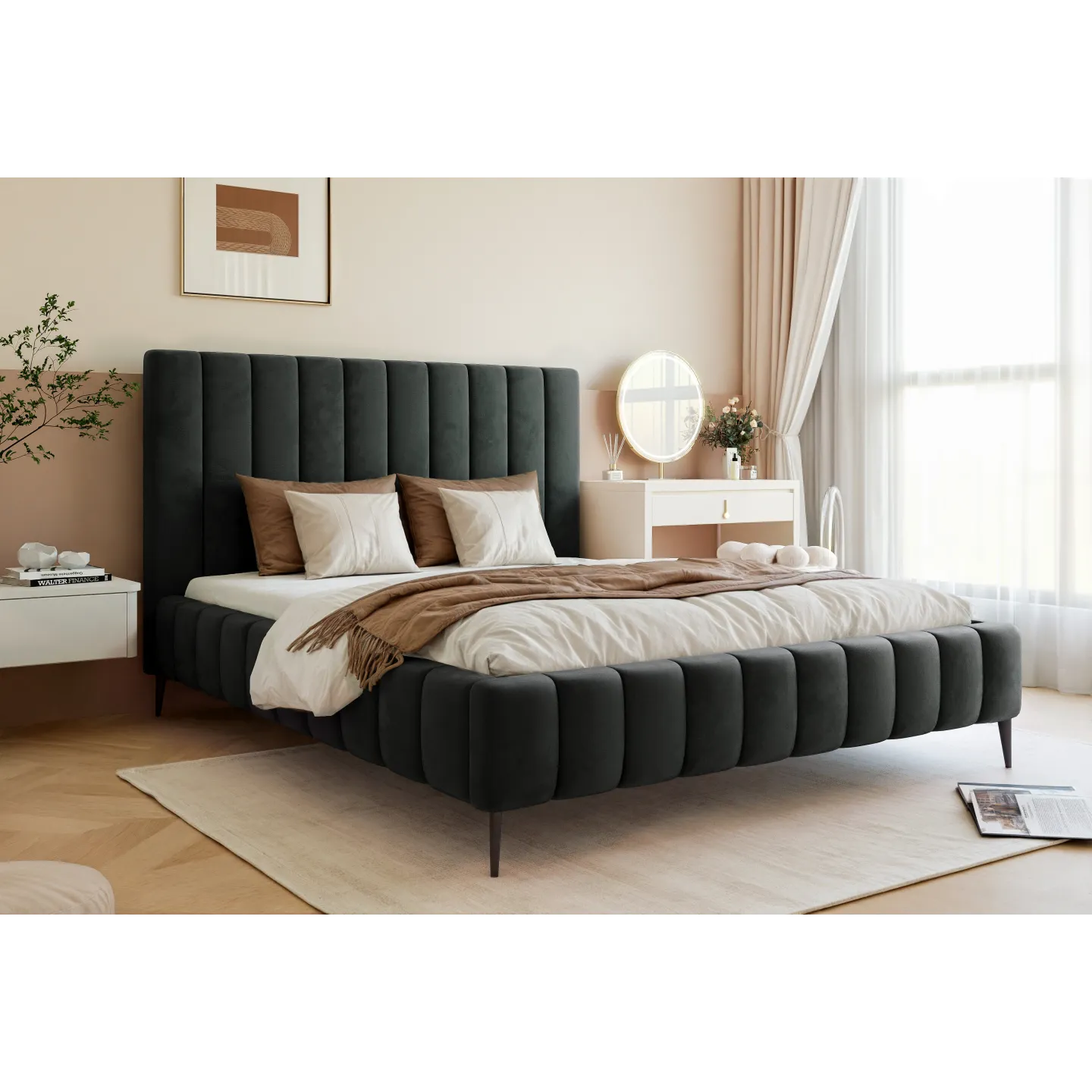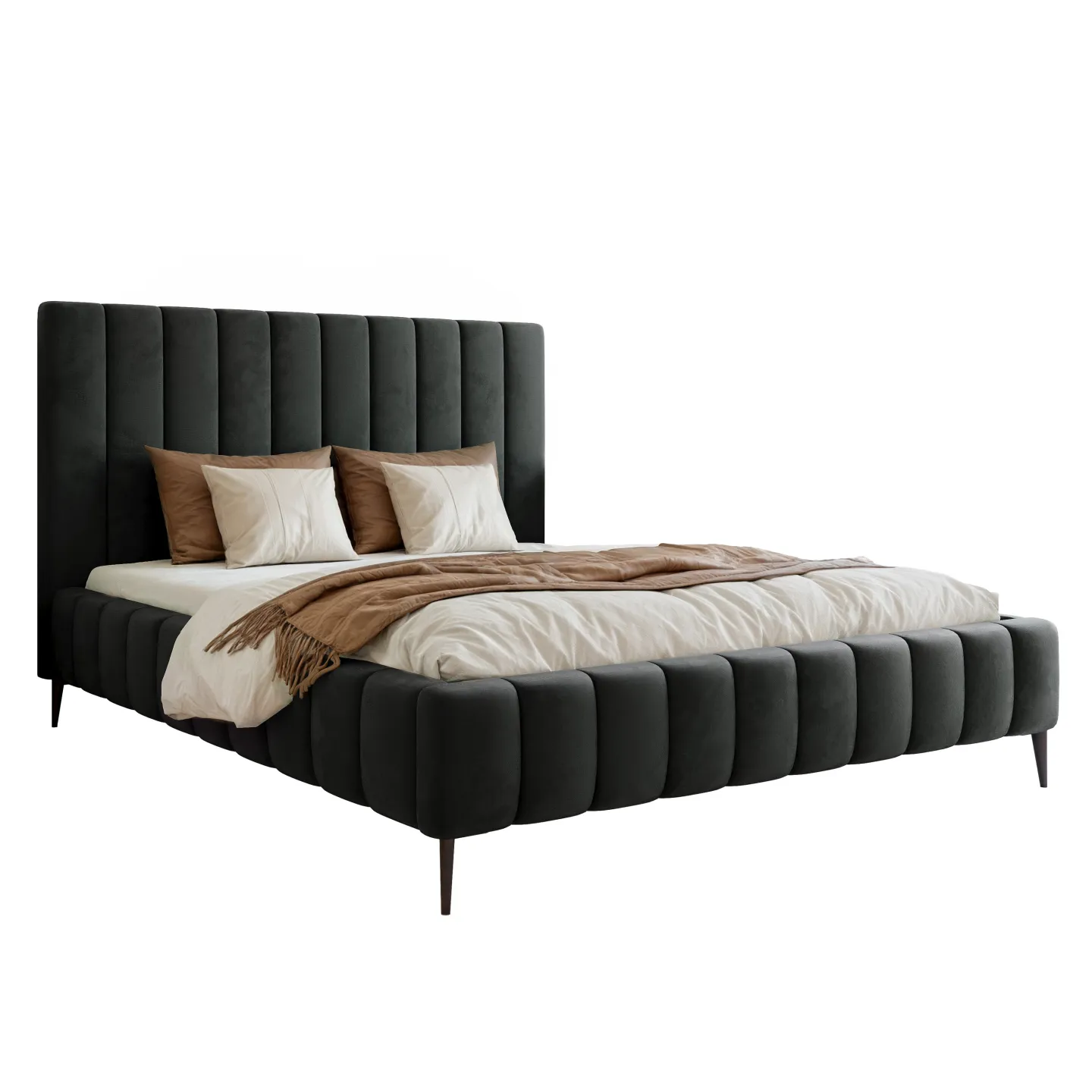 Hoher, gepolsterter Kopfteil mit modernen, vertikalen Steppungen. Bietet Komfort beim Anlehnen und verleiht dem Bett eine ruhige, luxuriöse Optik.