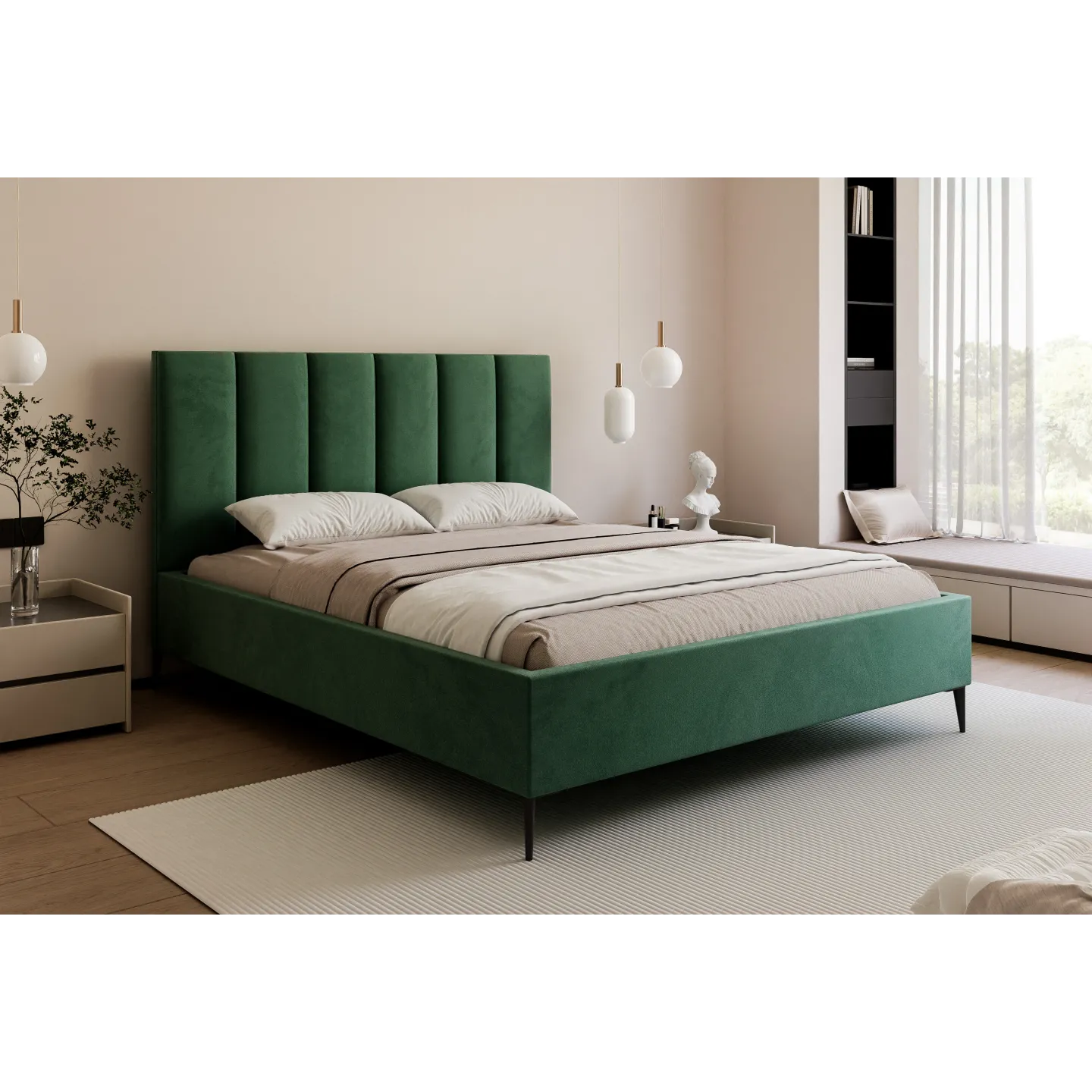 • Hohes Kopfteil mit breiten, vertikalen Paneelen für ein ruhiges, elegantes Gesamtbild.
