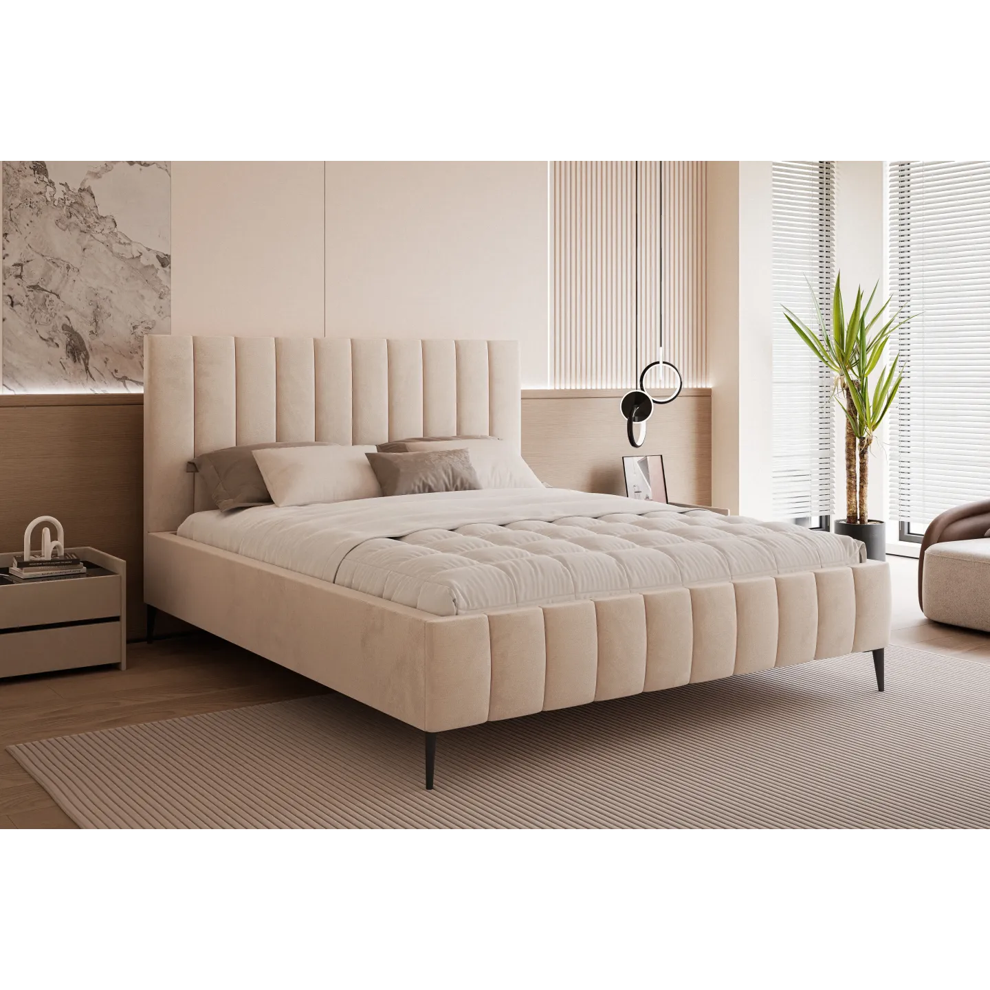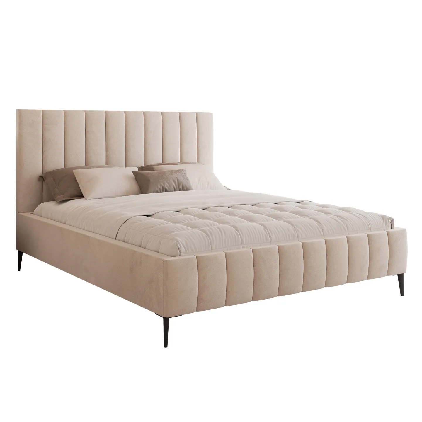 Polsterbett PAROS IV – Modernes Design mit hohen Füßen & vertikaler Steppung ist ein modernes Polsterbett, das minimalistisches Design mit einem eleganten, luxuriös wirkenden Auftritt verbindet. Das hohe, vertikal gesteppte Kopfteil, die schlanken Füße und die klar gestaltete Rahmenkonstruktion machen dieses Bett zum stilvollen Mittelpunkt jedes Schlafzimmers.