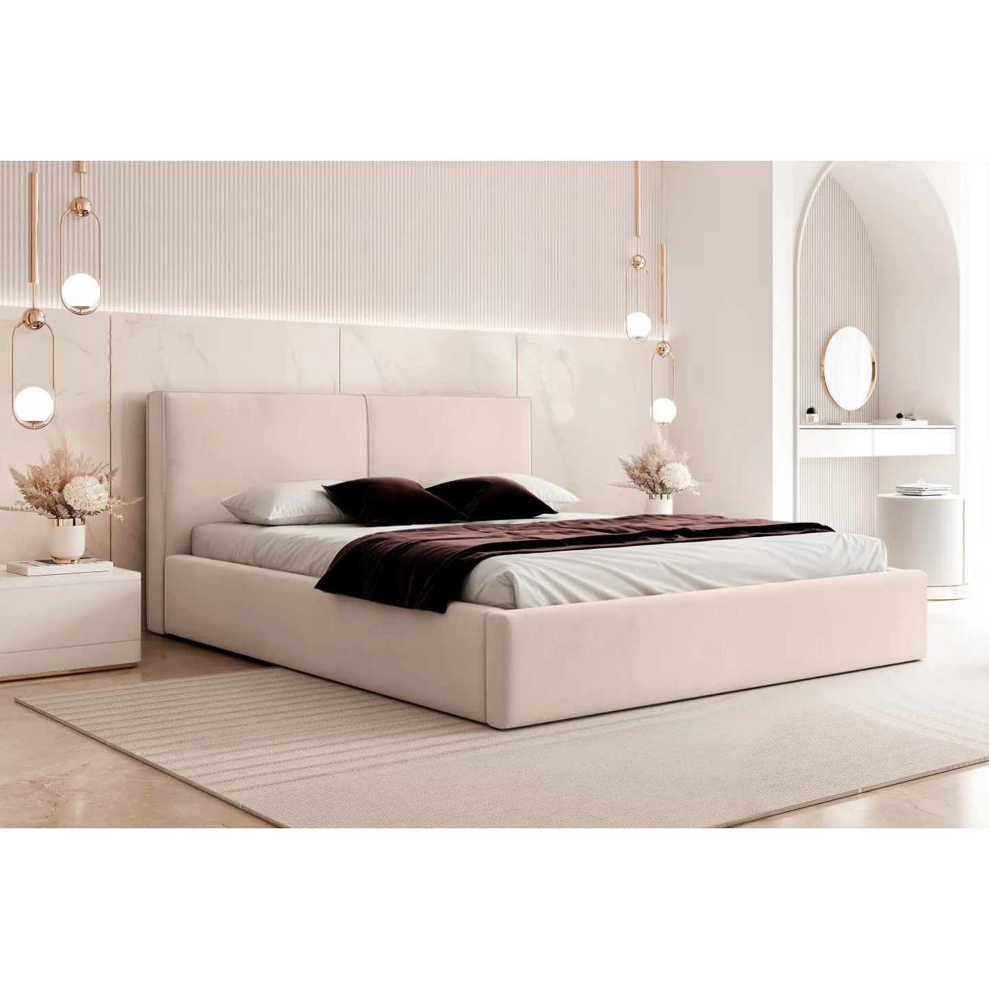 Die verwendeten Stoffe sind auf Langlebigkeit und einfache Pflege ausgelegt, sodass das Bett auch im intensiven Alltagseinsatz lange seine hochwertige Ausstrahlung bewahrt. KAMOS eignet sich als stilvoller Mittelpunkt im Hauptschlafzimmer ebenso wie für ein repräsentatives Gästezimmer oder ein modernes Studio.
