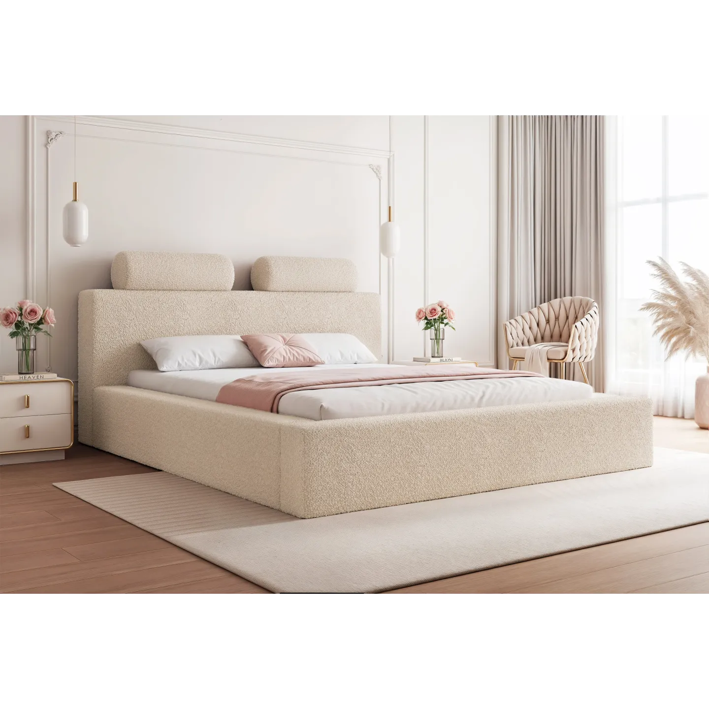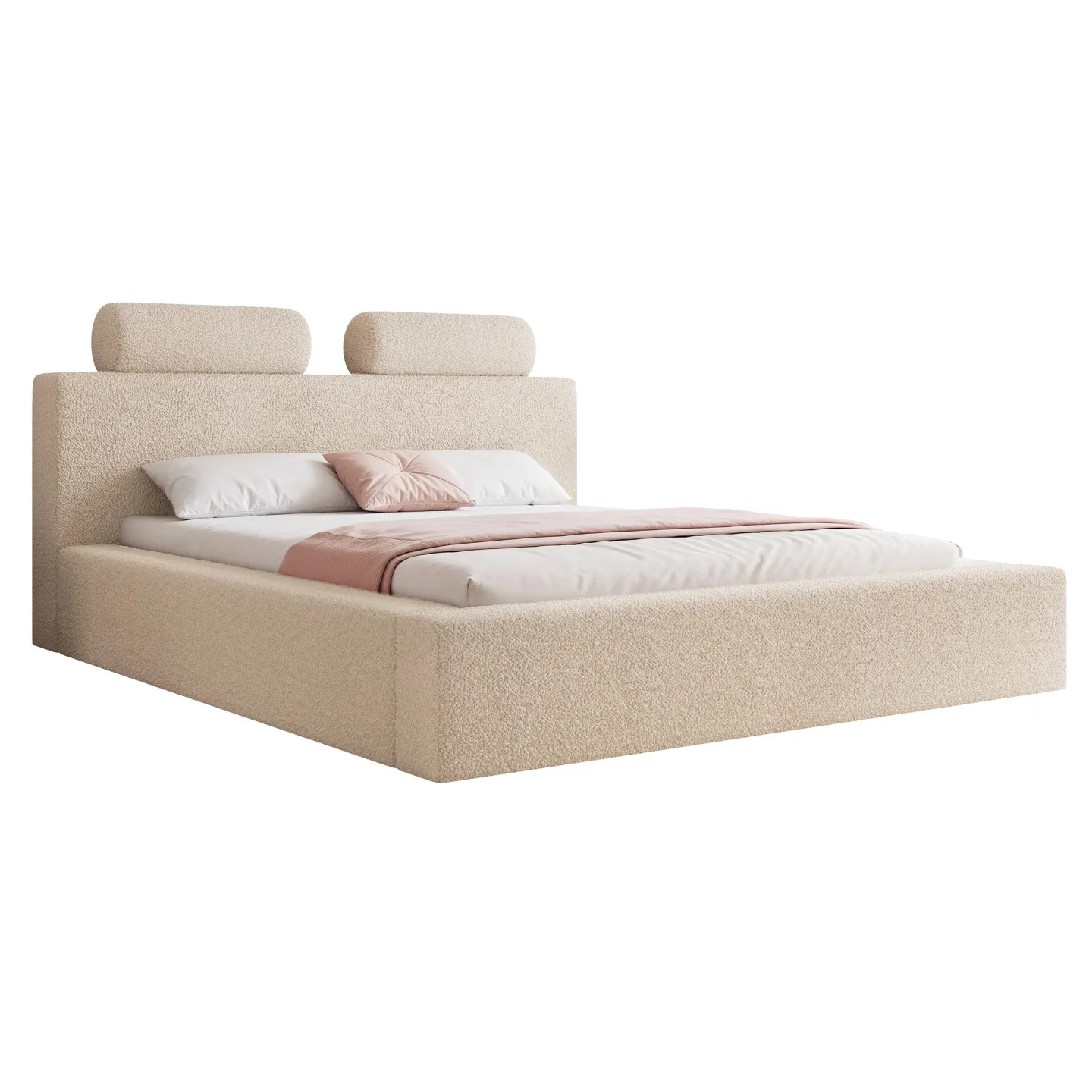 Das Kopfteil mit den zwei fixierten Nackenrollen bietet eine komfortable Unterstützung für Nacken und Rücken. So wird das Bett zur gemütlichen Relaxzone, in der Sie bequem lesen, arbeiten oder das Frühstück genießen können. Der Bezug aus Strukturstoff mit deutlich sichtbarer Webung verleiht dem Bett zusätzliche Tiefe und Eleganz.