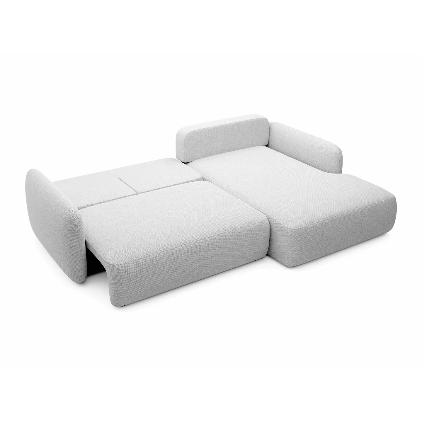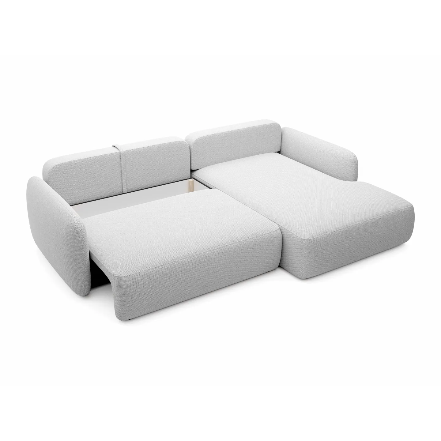 Die weichen, abgerundeten Armlehnen und Rückenpartien sowie die länglichen Rückenkissen bilden eine angenehme, durchgehende Linie. Die Kombination aus Schaumstoff und Federung unterstützt den Körper sowohl im Sitzen als auch im Liegen. Der Bettkasten ist dezent in das Sofa integriert und von außen kaum sichtbar, sodass das schlichte, moderne Erscheinungsbild erhalten bleibt.